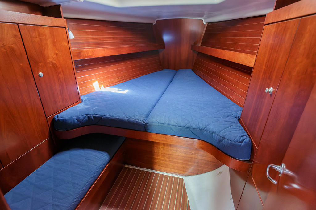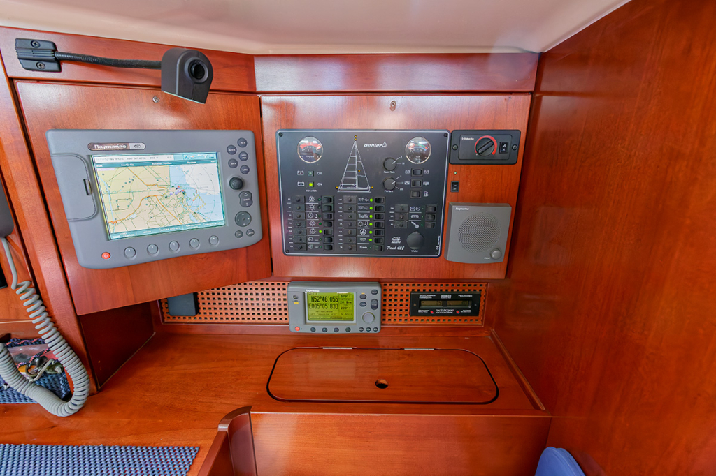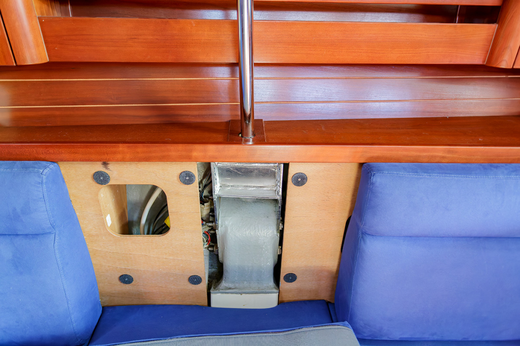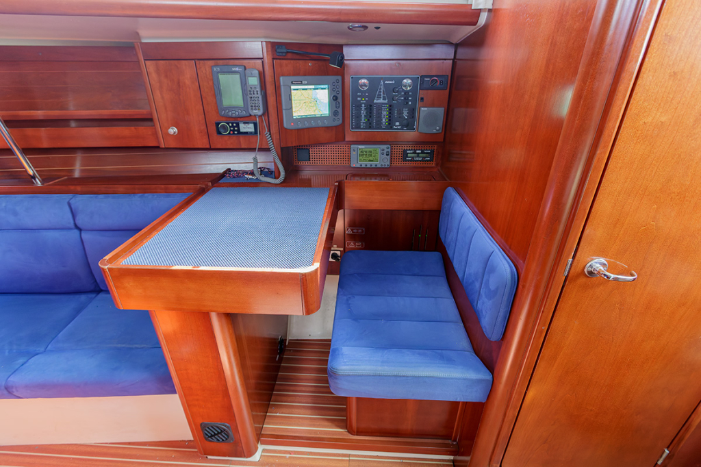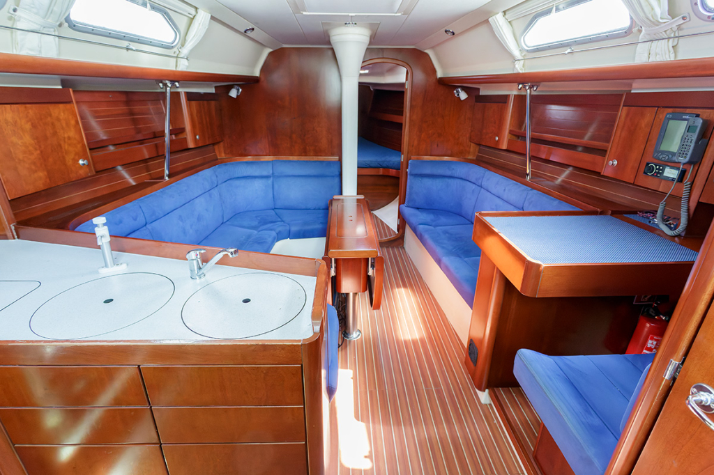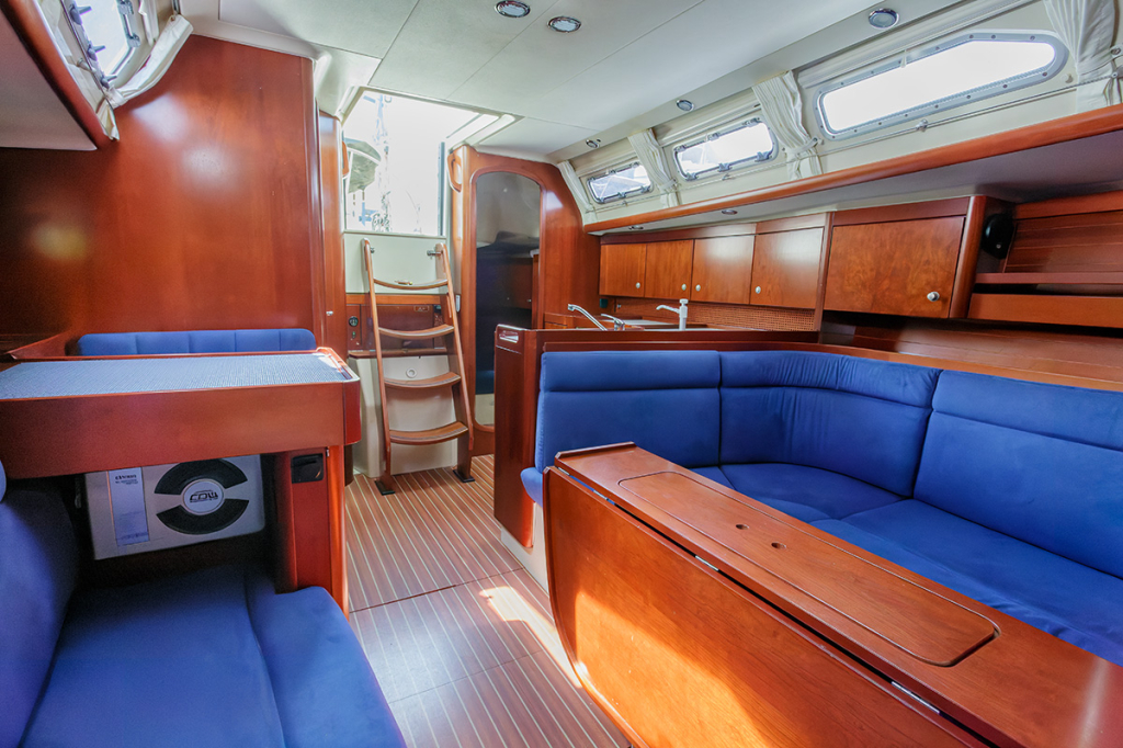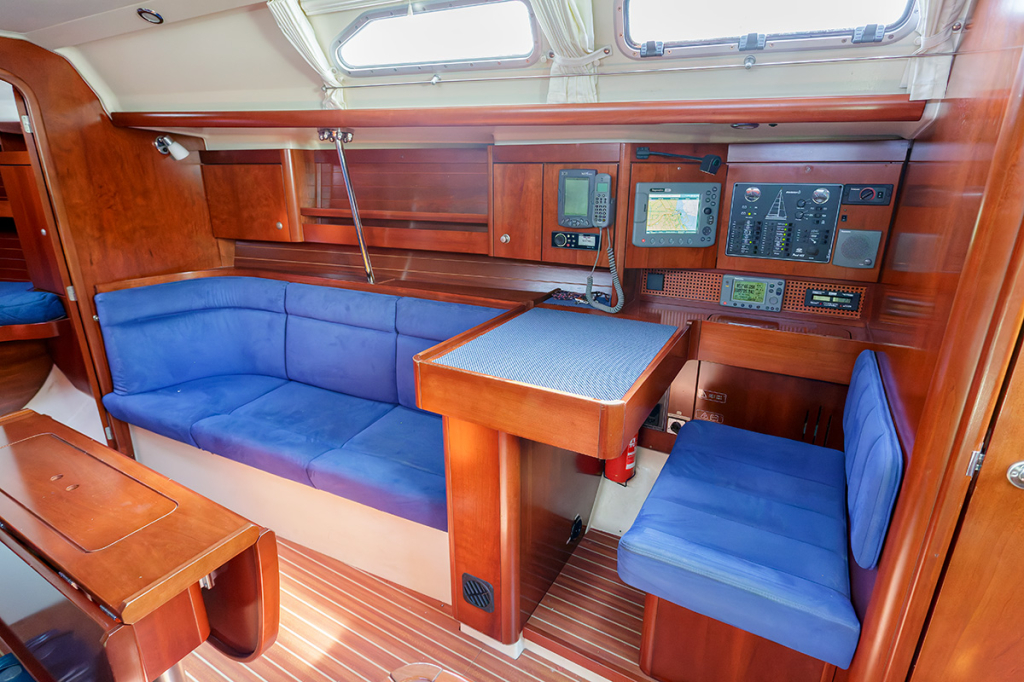 Haar interieur met donker hout, blauwe kussens en veel lichte kunststof vlakken is geoptimaliseerd voor zeilen op zee met een L-vormige kombuis, een goede kaartentafel voorhut en twee achterkajuiten. Deze boot heeft in de loop der jaren meerdere upgrades ondergaan, zie de volledige specificaties + lijst met inventaris voor alle details.