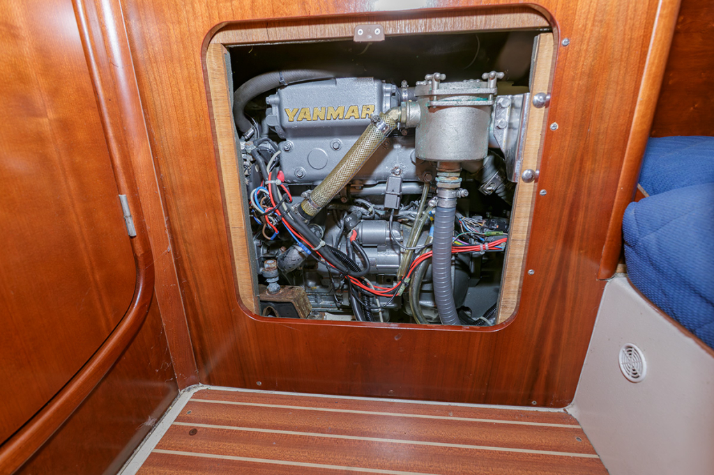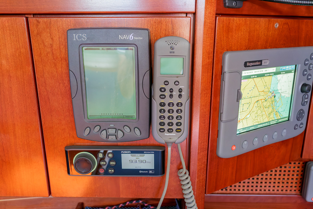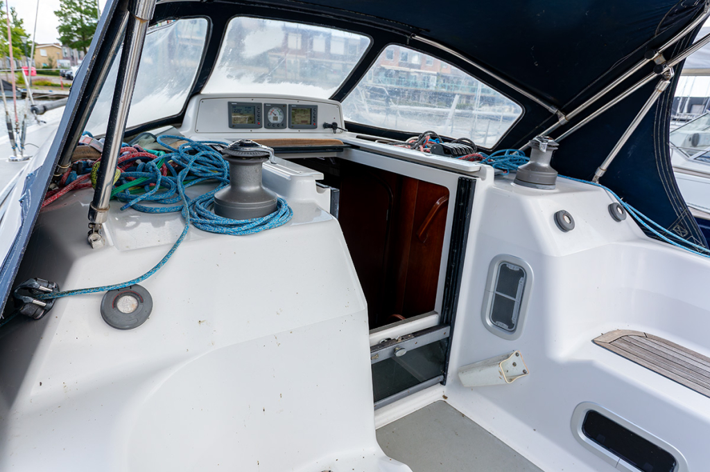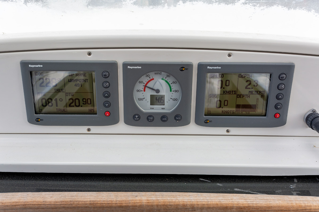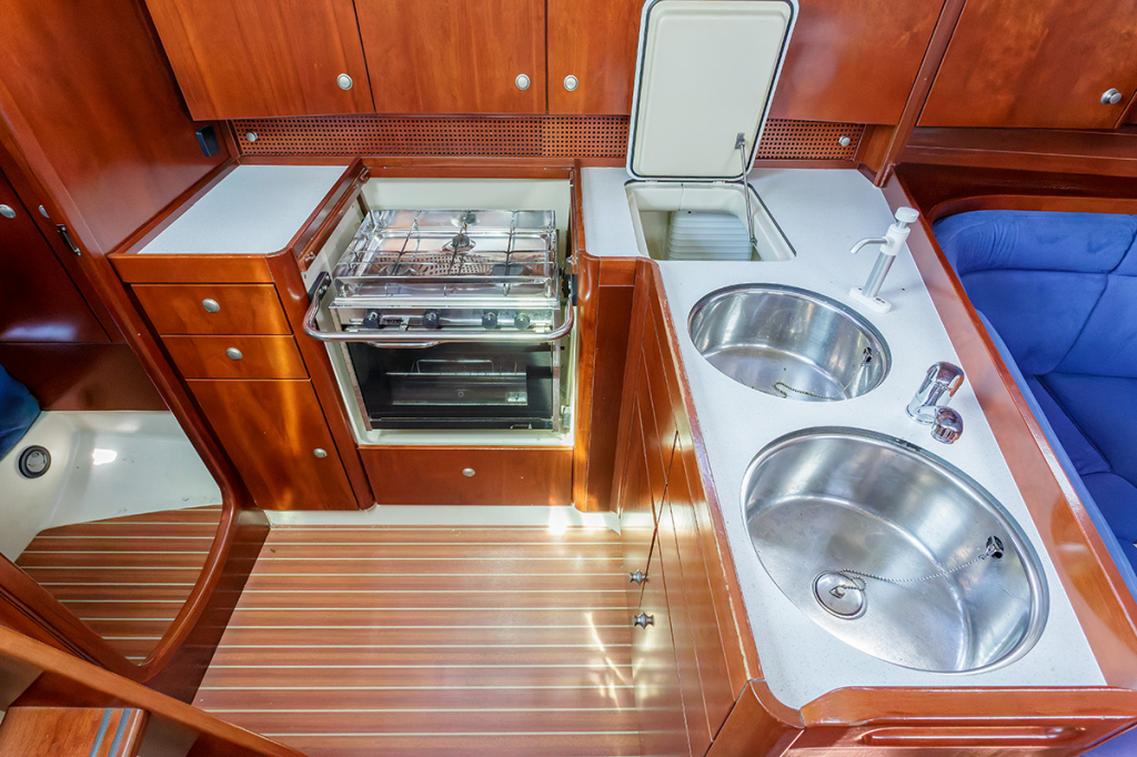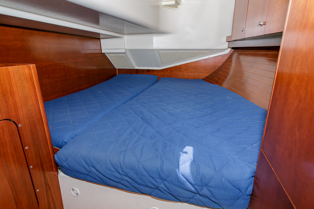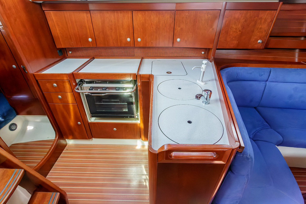 Haar interieur met donker hout, blauwe kussens en veel lichte kunststof vlakken is geoptimaliseerd voor zeilen op zee met een L-vormige kombuis, een goede kaartentafel voorhut en twee achterkajuiten. Deze boot heeft in de loop der jaren meerdere upgrades ondergaan, zie de volledige specificaties + lijst met inventaris voor alle details.