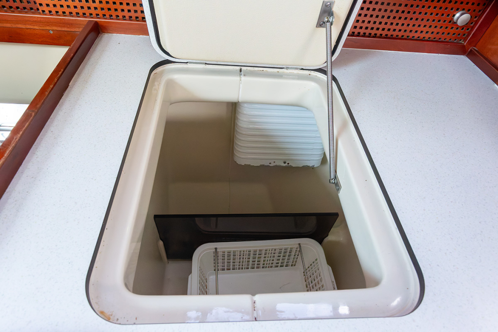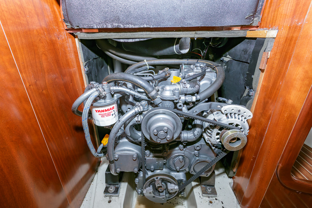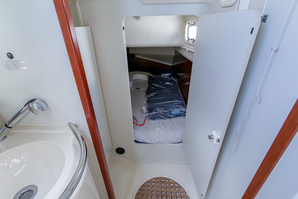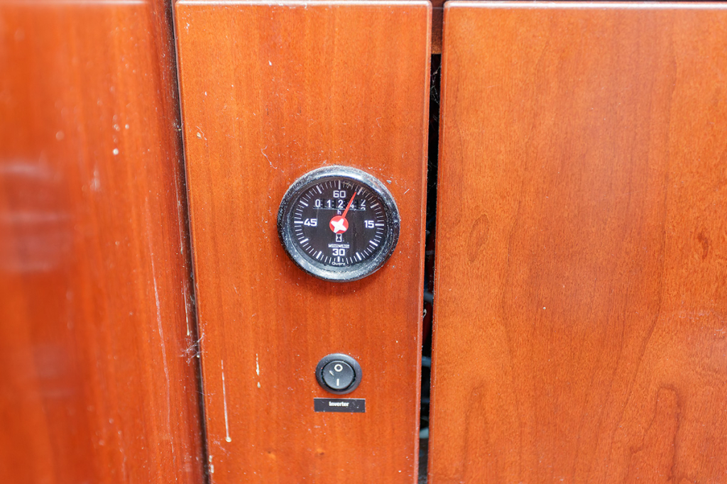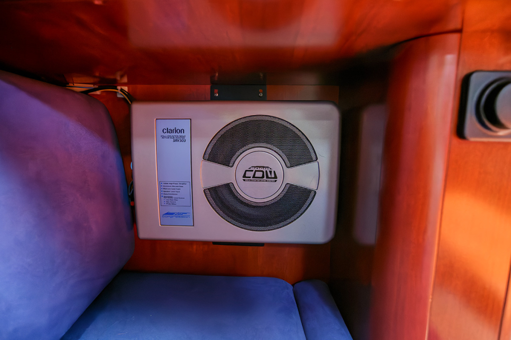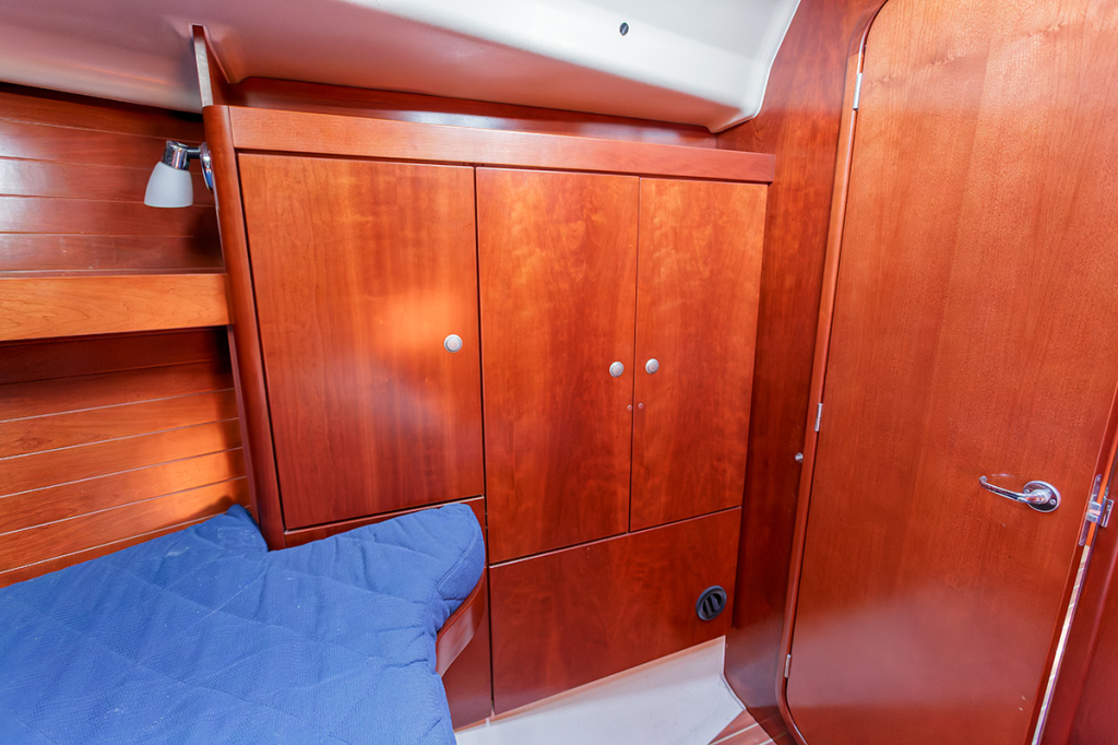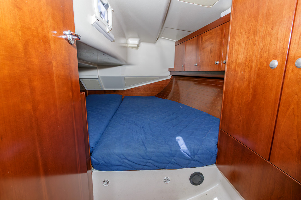 Haar interieur met donker hout, blauwe kussens en veel lichte kunststof vlakken is geoptimaliseerd voor zeilen op zee met een L-vormige kombuis, een goede kaartentafel voorhut en twee achterkajuiten. Deze boot heeft in de loop der jaren meerdere upgrades ondergaan, zie de volledige specificaties + lijst met inventaris voor alle details.