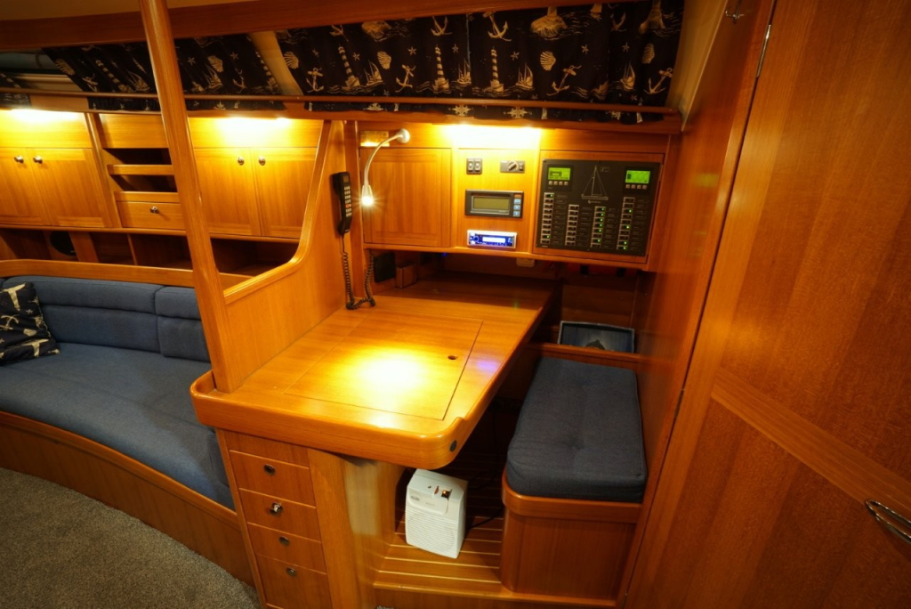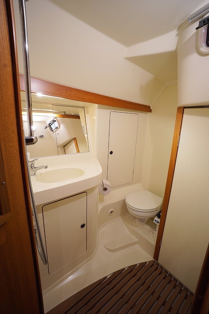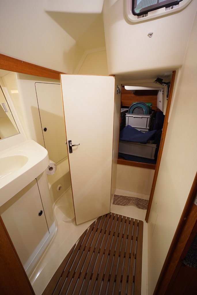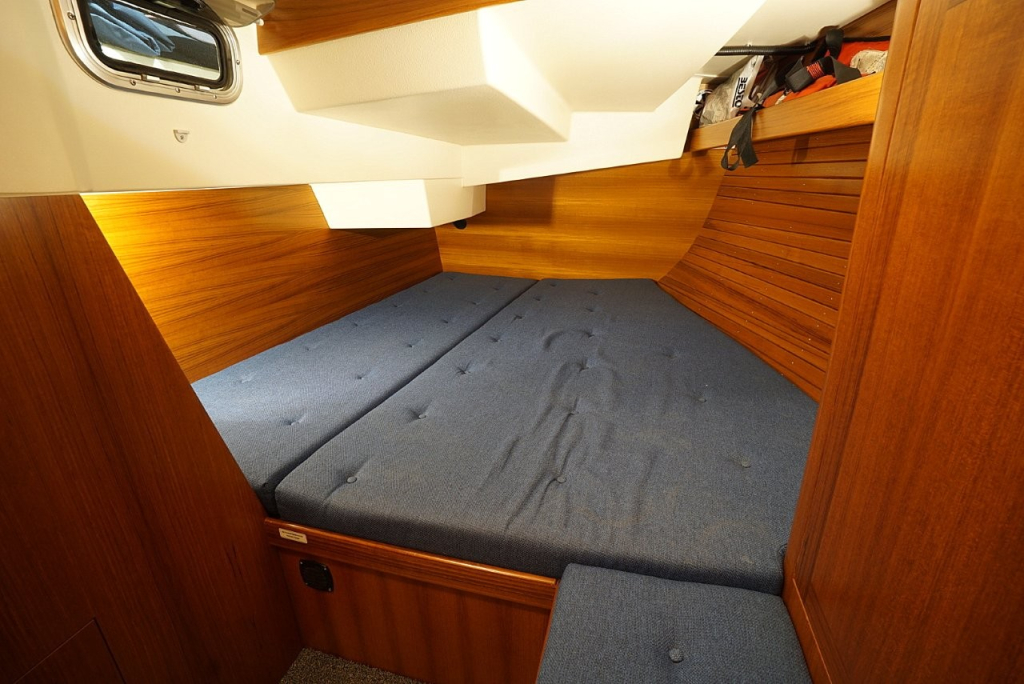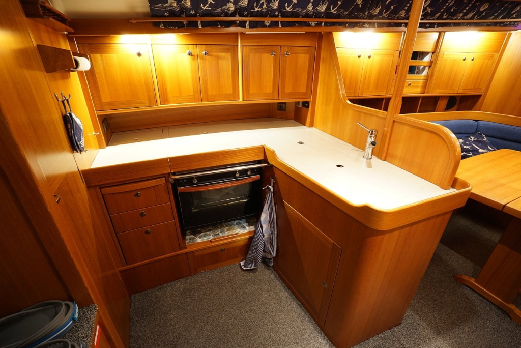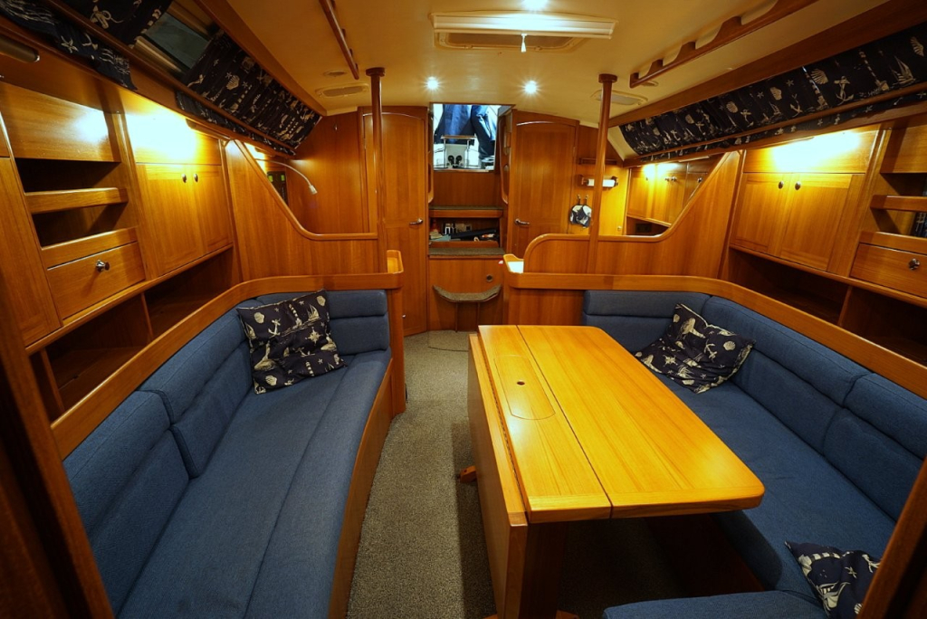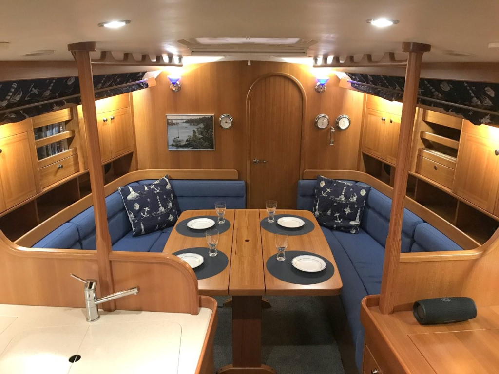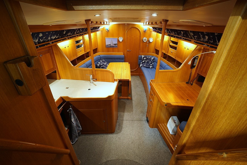 Onderdeks ervaart u direct de warme, klassieke uitstraling van massief houtwerk en de hoogwaardige afwerking waar deze Scandinavische schepen om bekend staan. De Comfortina 39 biedt een ruim en licht interieur met een praktische indeling die op langdurig verblijf aan boord gericht is. De salon is comfortabel en uitnodigend, met voldoende zit- en opbergruimte. De kombuis is functioneel en goed uitgerust, ideaal voor zowel korte trips als langere reizen. De voor- en achterhut bieden volwaardige slaapplaatsen met privacy en comfort, en de derde hut in het achterschip is wat kleiner dan de andere en is ideaal om te gebruiken als extra bergruimte voor lange reizen. Deze ruimte is overigens ook bereikbaar via de kuip.