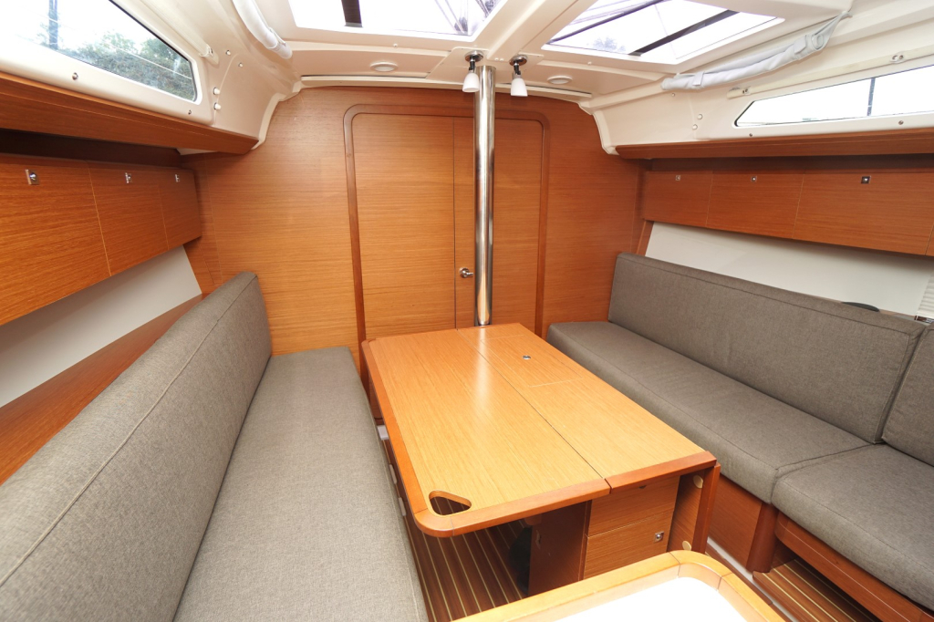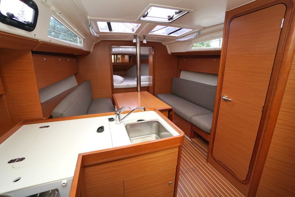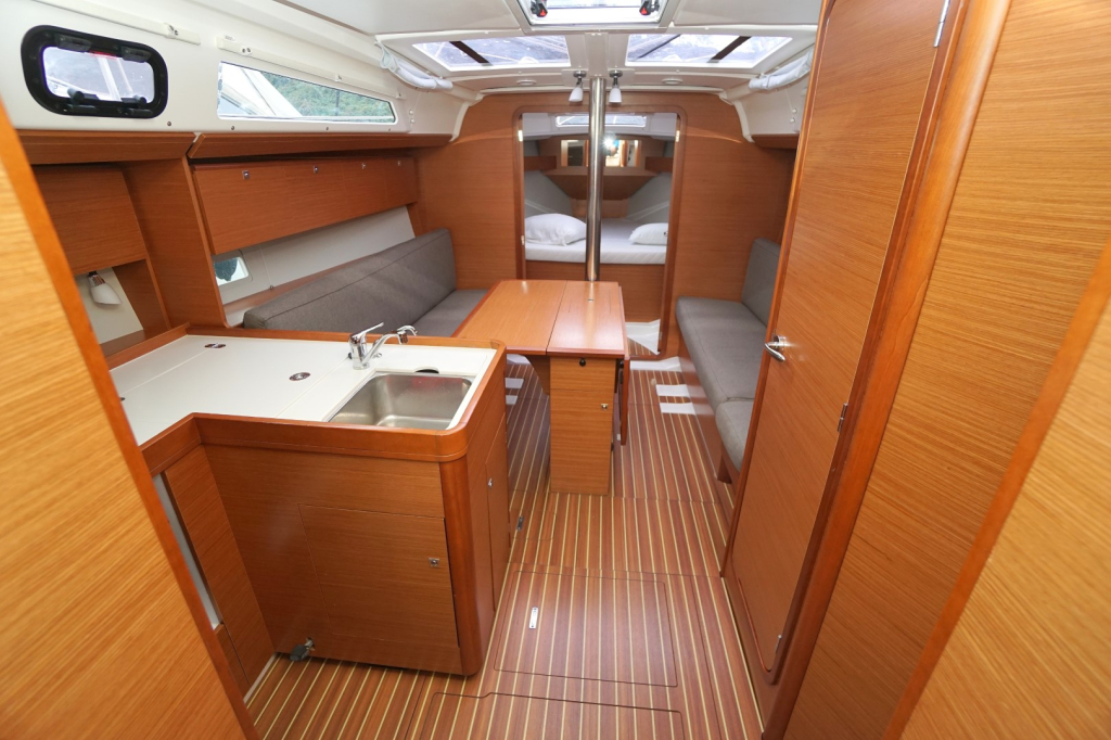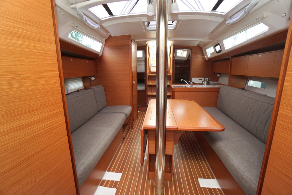 Met drie ruime hutten biedt deze Dufour voldoende slaapruimte voor zes personen. Elke hut is uitgerust met comfortabele matrassen, slimme opbergmogelijkheden en ventilatie die zorgt voor een aangenaam verblijf, zelfs tijdens warmere dagen. De salon voelt licht en ruim aan dankzij het moderne ontwerp, de hoogwaardige afwerking en het natuurlijke licht dat royaal naar binnen valt via de panoramische vensters.