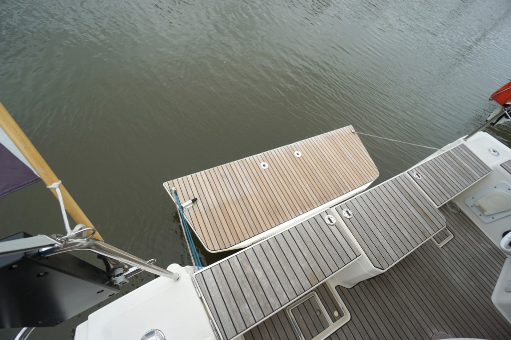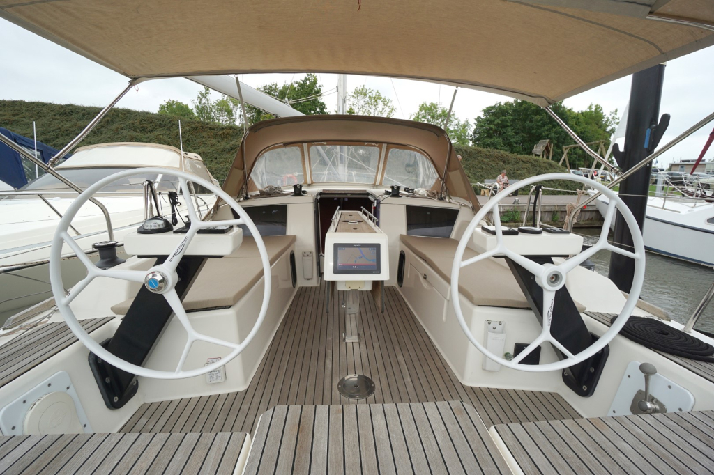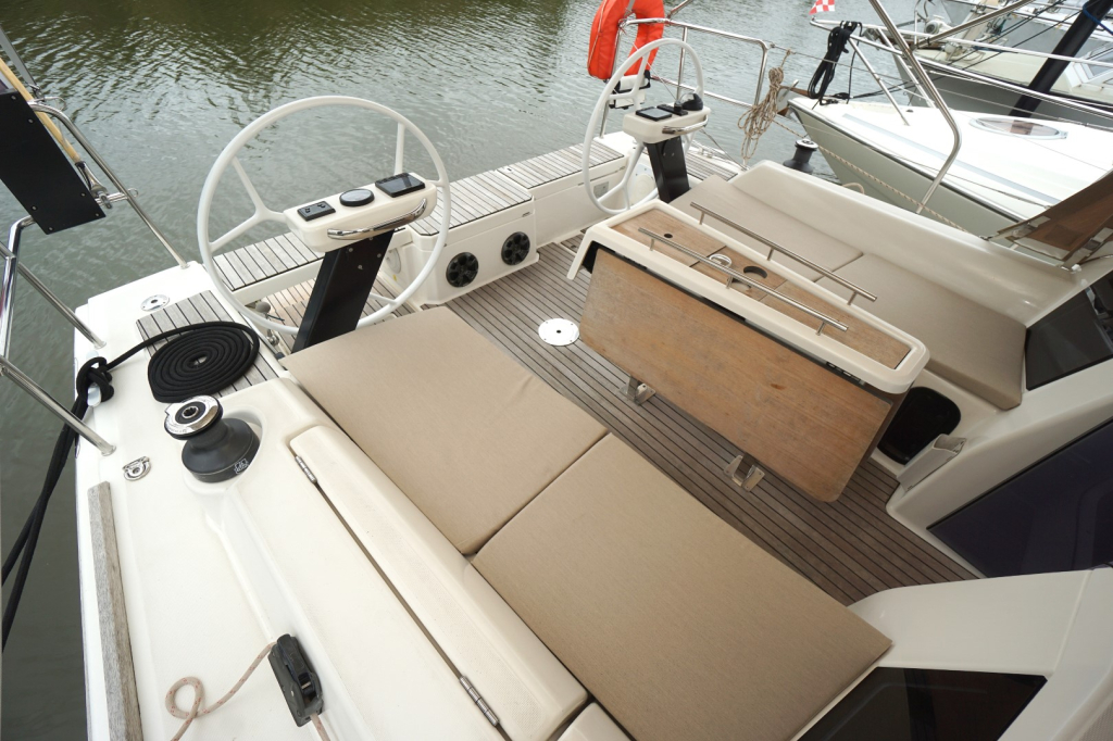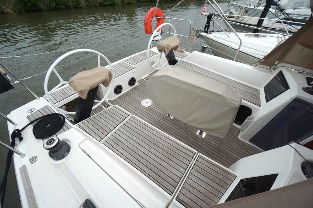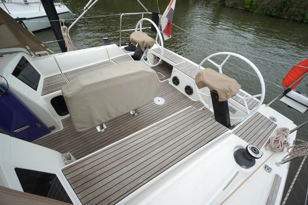 Buiten nodigt het brede en goed doordachte dek uit tot comfortabel zeilen én ontspannen loungen. De keerfok maakt wenden een gemakkelijke opgave en de dubbele stuurwielen geven een uitstekend zicht en controle, terwijl de brede kuip een sociale en veilige plek is voor bemanning en gasten. Het zwemplatform achteraan maakt een duik in zee of het instappen in de bijboot eenvoudig en plezierig.