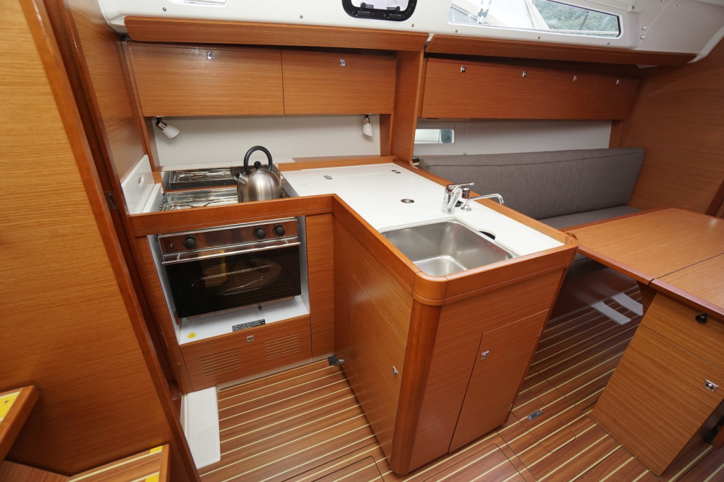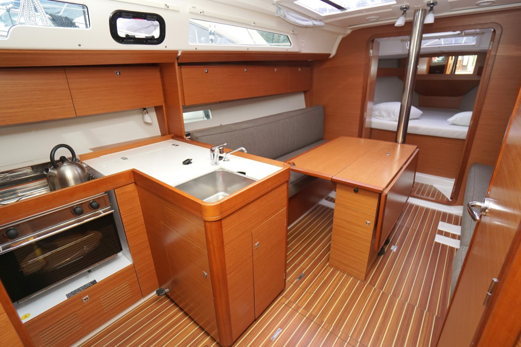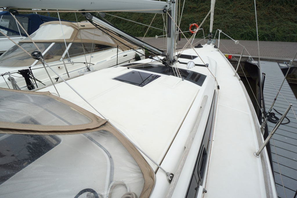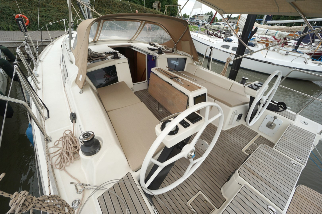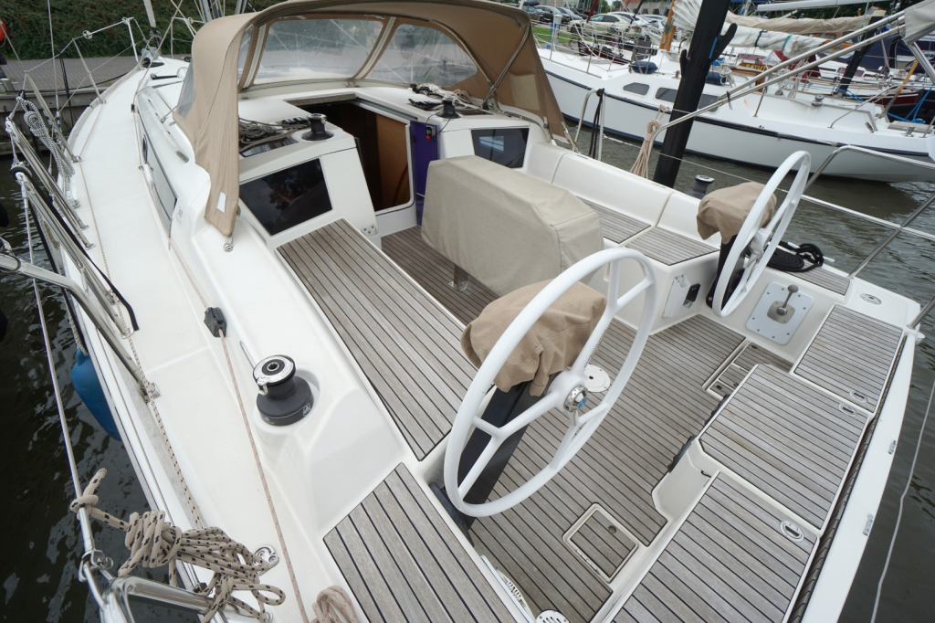 Buiten nodigt het brede en goed doordachte dek uit tot comfortabel zeilen én ontspannen loungen. De keerfok maakt wenden een gemakkelijke opgave en de dubbele stuurwielen geven een uitstekend zicht en controle, terwijl de brede kuip een sociale en veilige plek is voor bemanning en gasten. Het zwemplatform achteraan maakt een duik in zee of het instappen in de bijboot eenvoudig en plezierig.