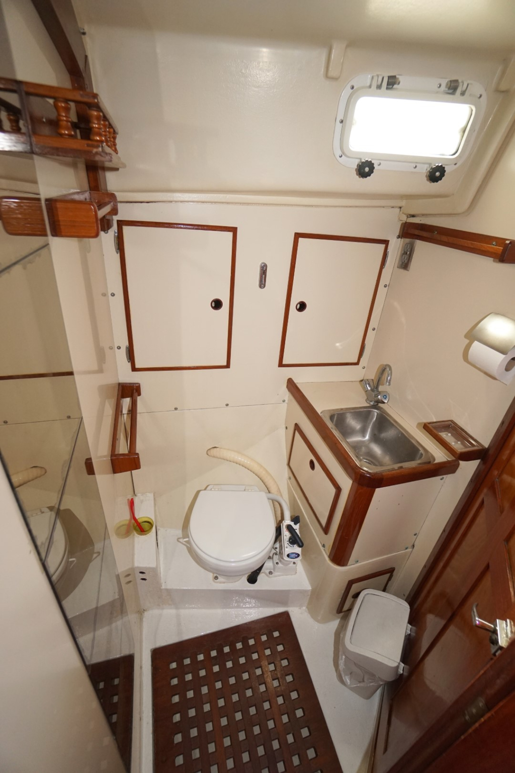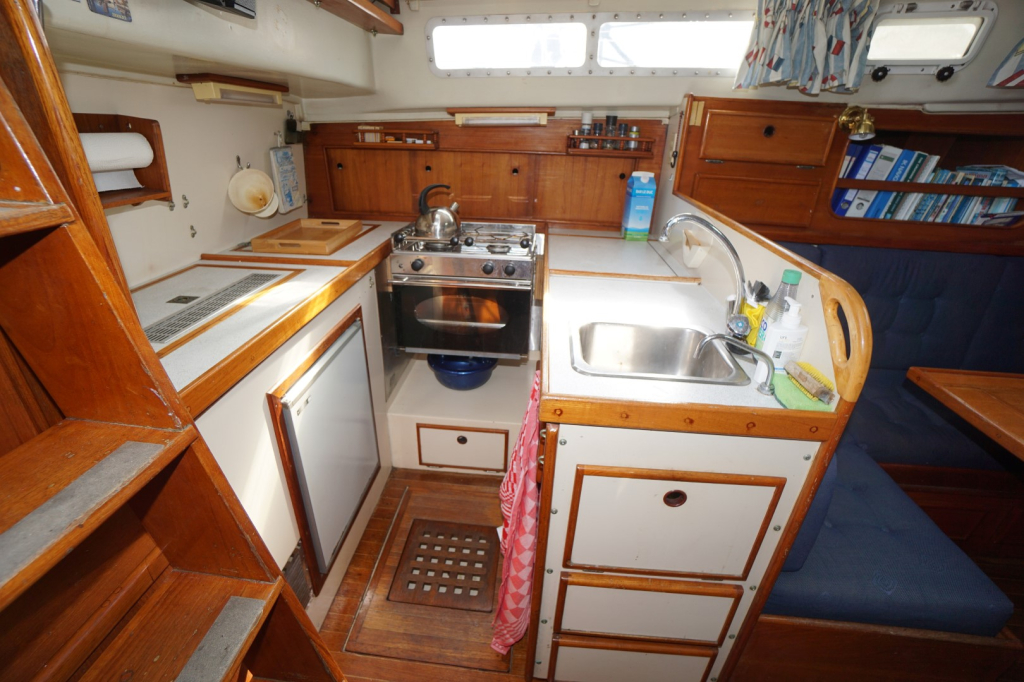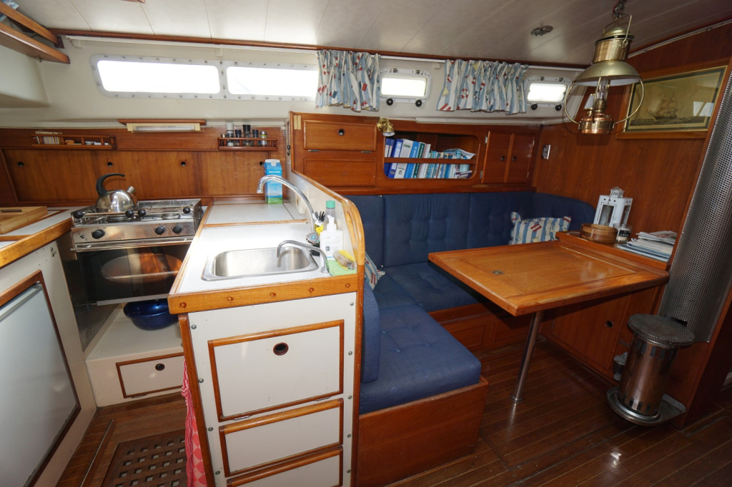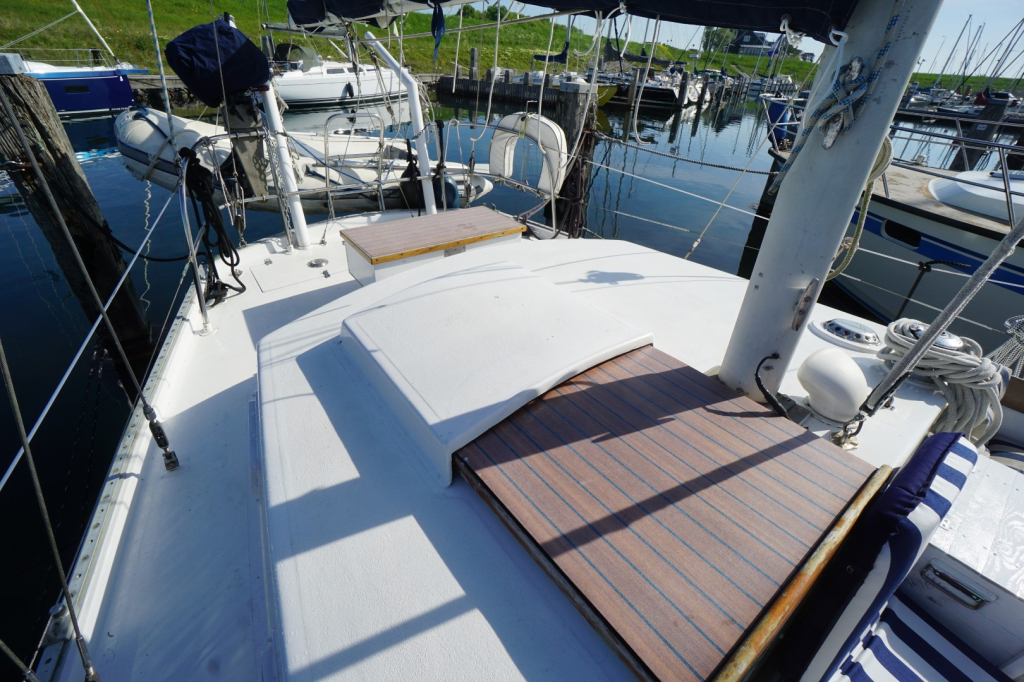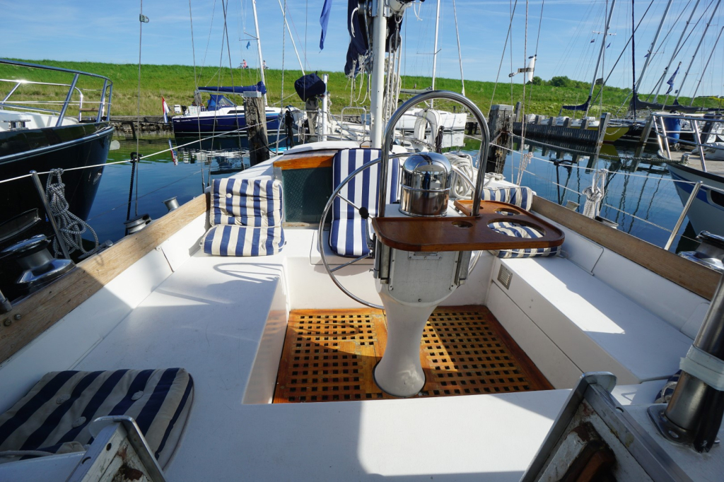 Het interieur biedt alles wat je nodig hebt voor comfortabele tochten. De eigenaarshut bevindt zich achterin en is via een doorgang vanuit de salon te bereiken maar beschikt ook over een aparte toegang vanuit de kuip, wat zorgt voor extra privacy. Verder is er een gezellige salon, een praktische kombuis met oven, koelkast en de nodige bergruimte, en een aparte navigatiehoek. Er zijn in totaal twee hutten en twee toiletten waarvan eentje met een douchevoorziening. Dit schip is verrassend ruim en biedt voldoende bergruimte voor een leven aan boord of lange reizen. Of lekker van de buitenlucht genieten kan natuurlijk ook. De kuip is bijzonder ruim en wordt beschermt tegen de elementen door een vaste buiskap. Ideaal als het wat minder fraai weer is maar zeker fijn ook op warme dagen om wat schaduw op te kunnen zoeken.