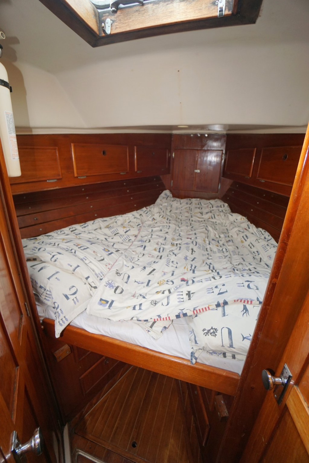Bed in voorhut: loopt taps toe van 2.00 m. naar 0.60 m breed en 1.95 m lang.