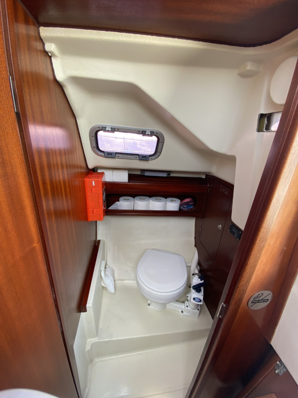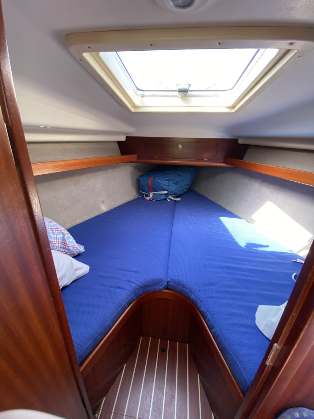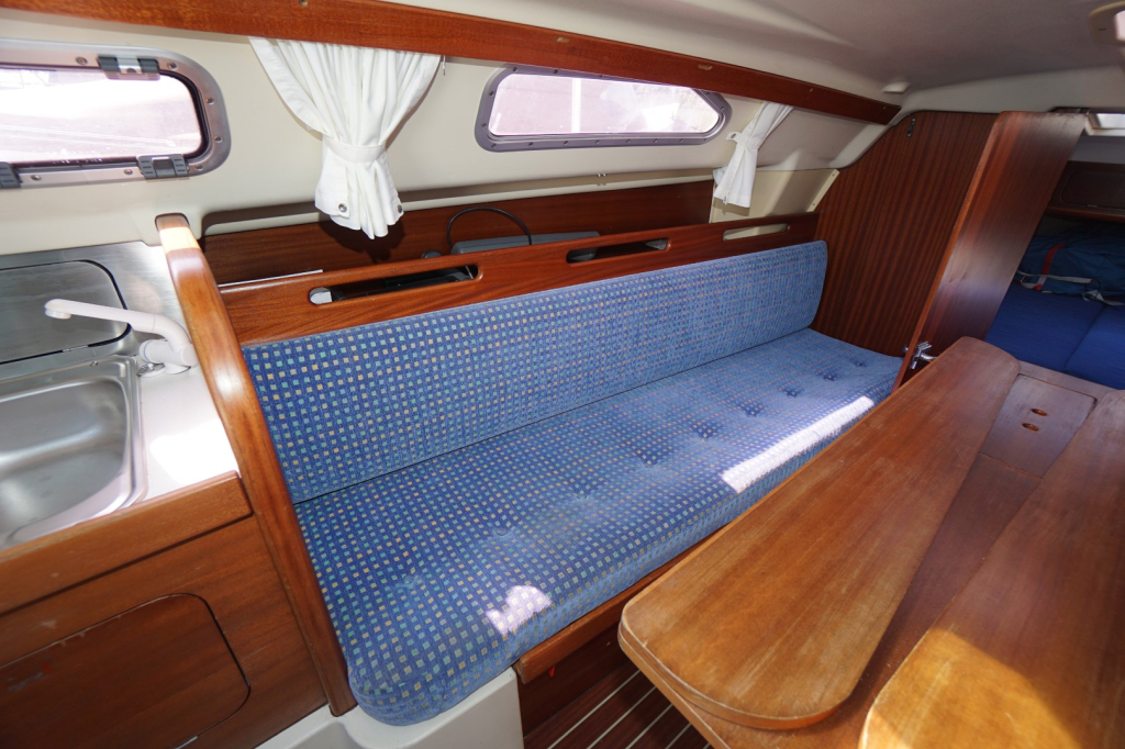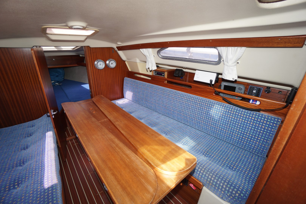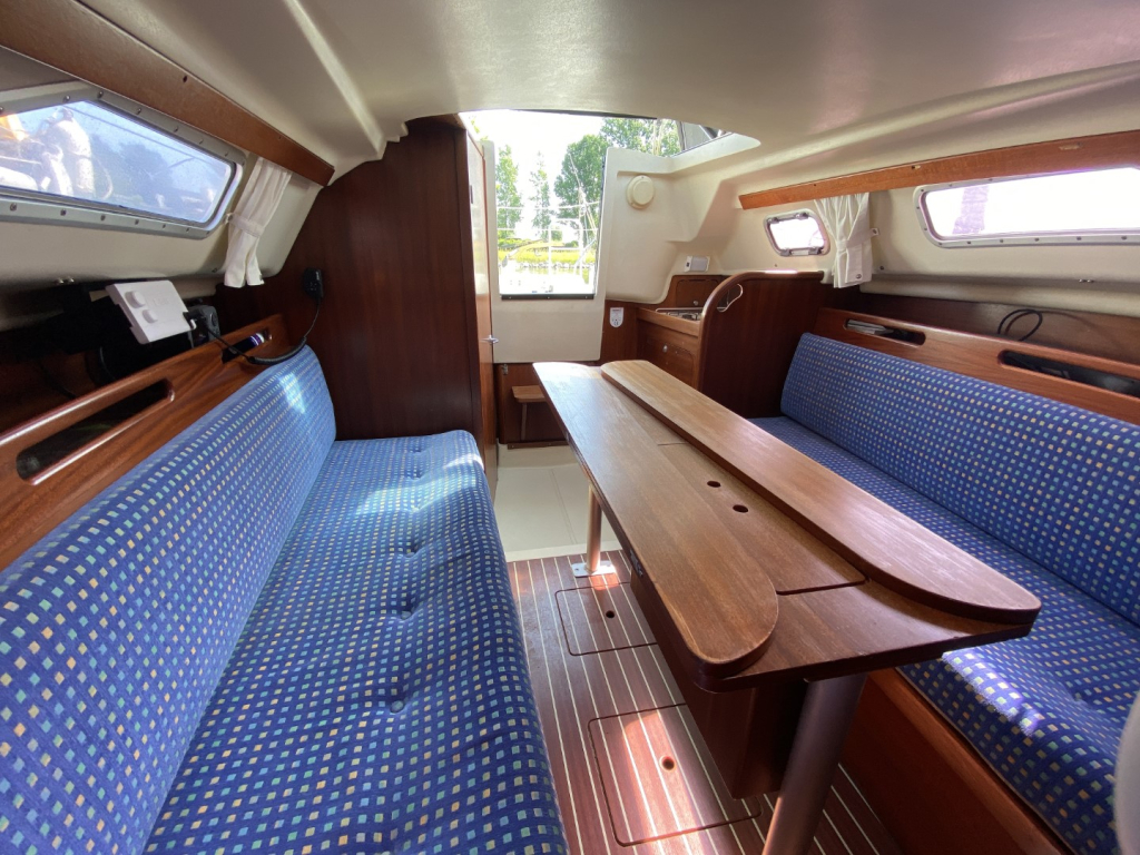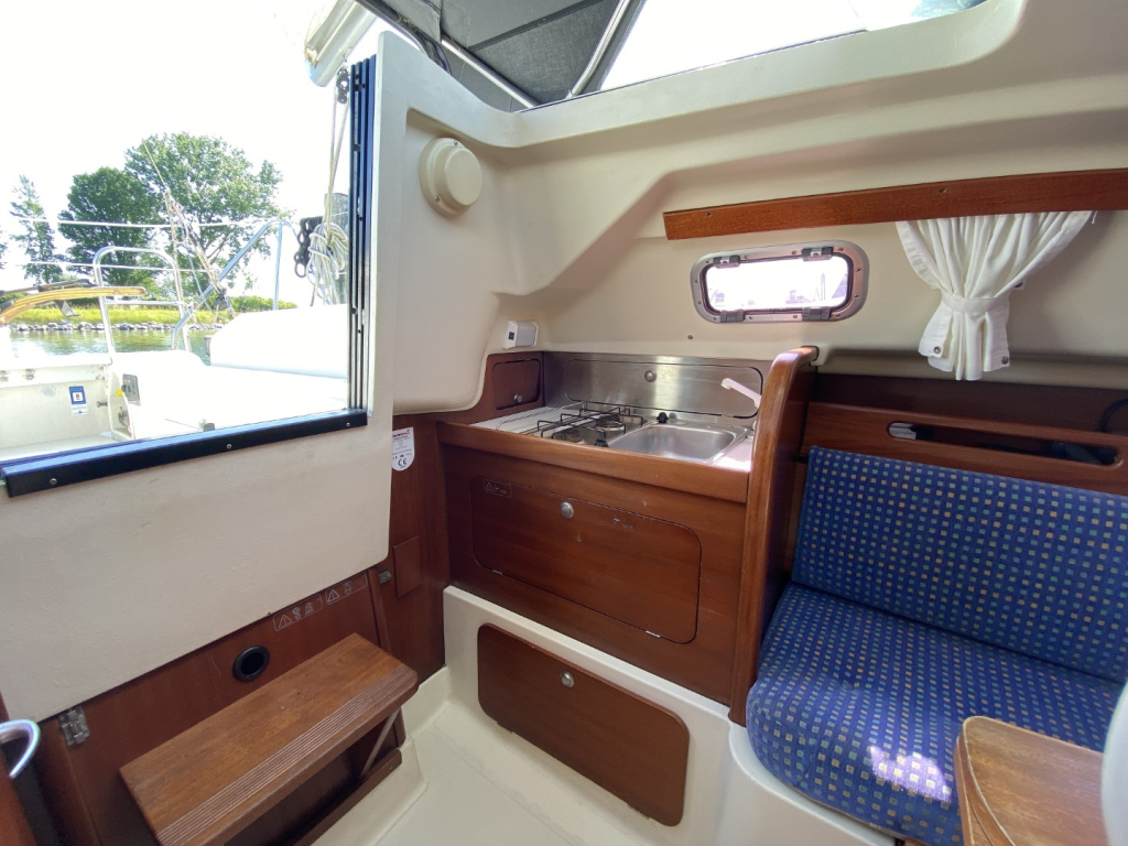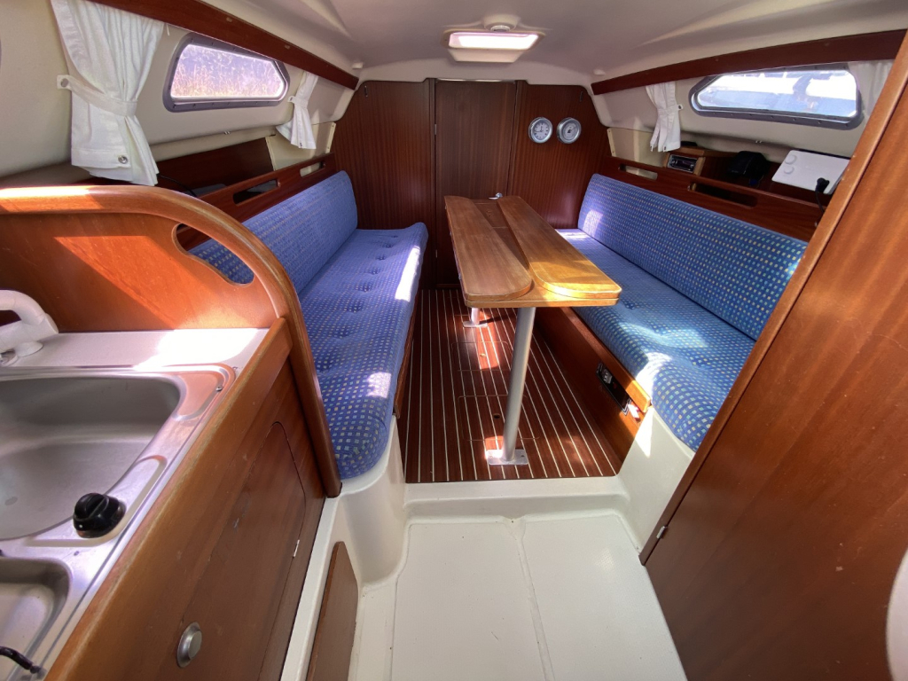 Binnen in het schip tref je een sfeervol interieur aan met een ruime voorpiek, twee langsbanken, een tafel in het midden, een compacte maar complete kombuis en een separate toiletruimte. Met haar praktische indeling en goede stahoogte biedt de kajuit voldoende comfort voor langere weekenden of korte vakanties op het water.