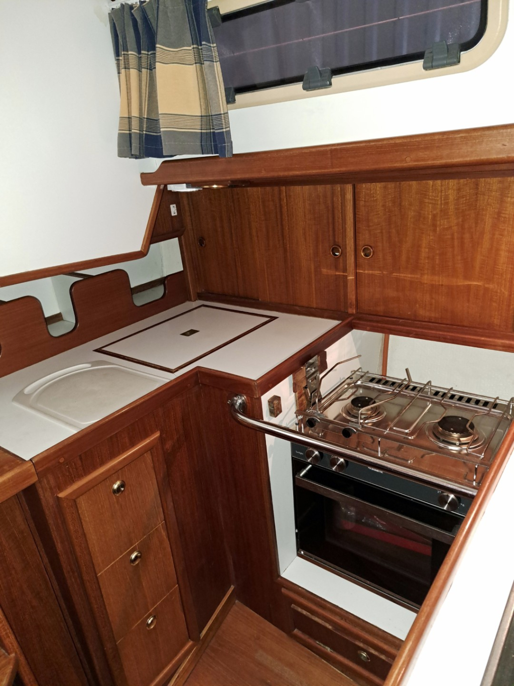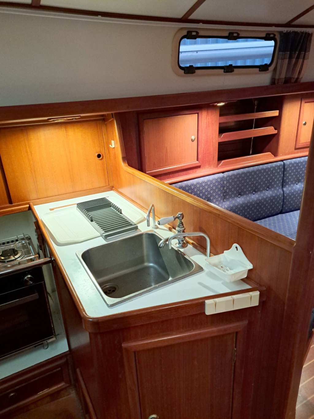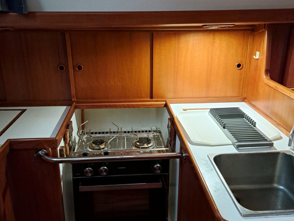 De kombuis bevindt zich aan bakboordzijde en beschikt over een fornuis, gootsteen en opbergkasten, waardoor koken op zee handig is. Het navigatiestation bevindt zich tegenover de kombuis, uitgerust met essentiële instrumenten en een kaarttafel. Het goed geplande ruimtegebruik zorgt ervoor dat het interieur van de boot groter aanvoelt dan het is, met verrassend veel hoofdruimte en leefruimte.