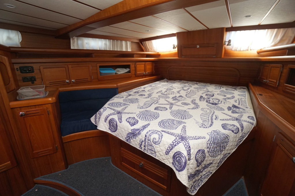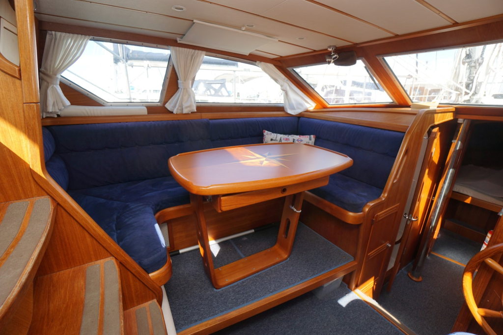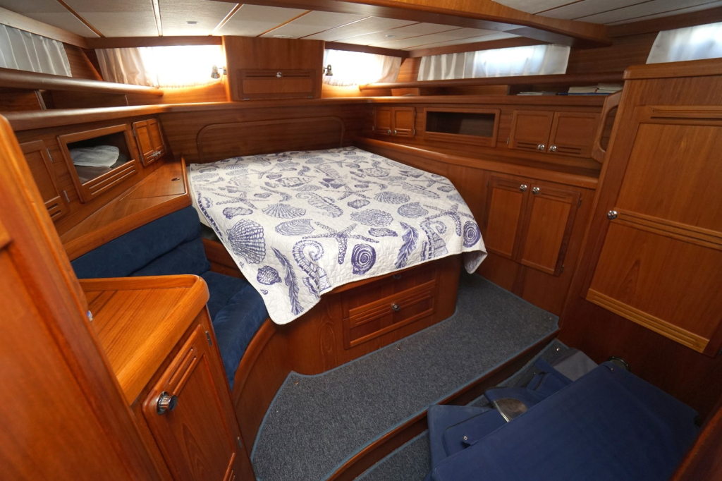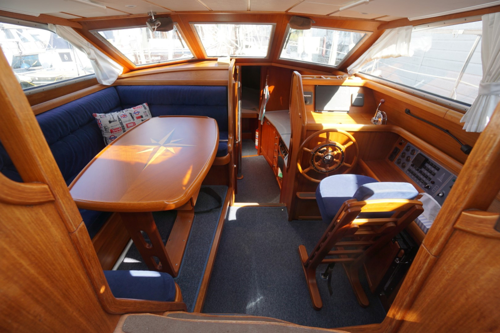 Binnenin valt direct de warme en tijdloze sfeer op, met prachtig houtwerk en veel natuurlijk licht. De salon is ruim en uitnodigend, met een comfortabele zithoek, een goed uitgeruste navigatiehoek en een praktische kombuis. De eigenaars hut achterin is voorzien van een tweepersoonsbed terwijl de gastenhut voorin eveneens comfortabel en ruim is. Natuurlijk is er voorzien in een ruime natte cel met separate douche gelegenheid. Overal aan boord is er voldoende opbergruimte. De slimme indeling, bovengemiddelde afwerking en een gevoel van degelijkheid is ook aan boord van deze Nauticat 37 precies zoals dat u van een Nauticat mag verwachten.