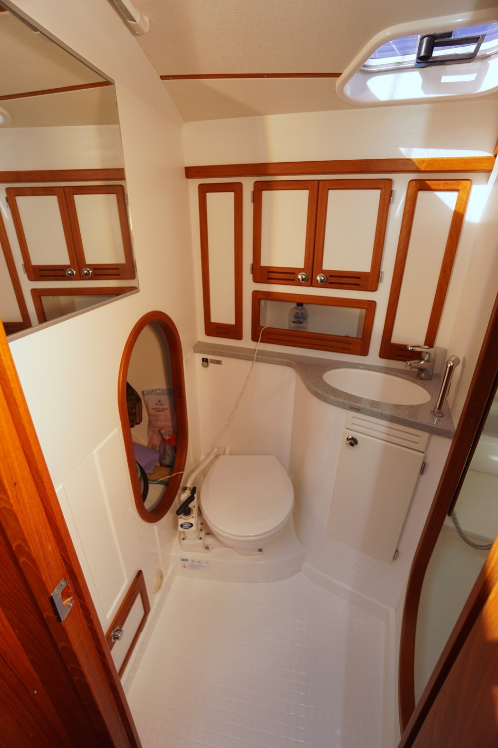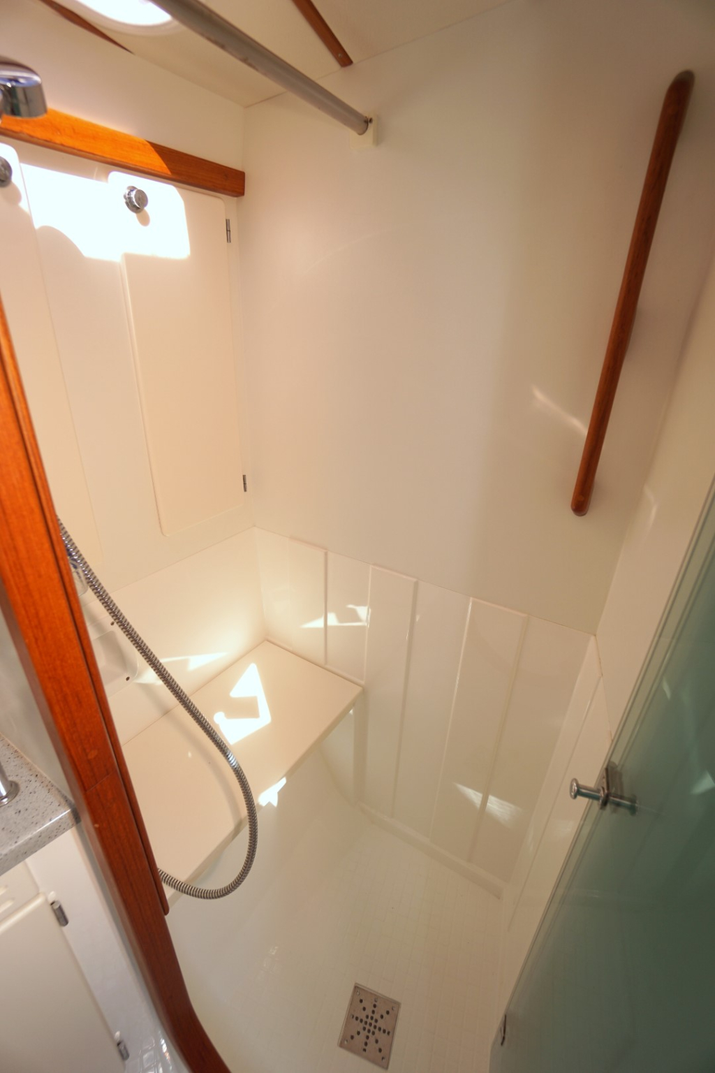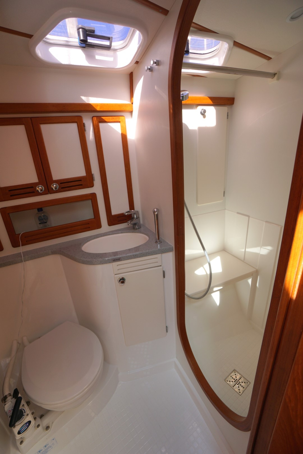 Binnenin valt direct de warme en tijdloze sfeer op, met prachtig houtwerk en veel natuurlijk licht. De salon is ruim en uitnodigend, met een comfortabele zithoek, een goed uitgeruste navigatiehoek en een praktische kombuis. De eigenaars hut achterin is voorzien van een tweepersoonsbed terwijl de gastenhut voorin eveneens comfortabel en ruim is. Natuurlijk is er voorzien in een ruime natte cel met separate douche gelegenheid. Overal aan boord is er voldoende opbergruimte. De slimme indeling, bovengemiddelde afwerking en een gevoel van degelijkheid is ook aan boord van deze Nauticat 37 precies zoals dat u van een Nauticat mag verwachten.