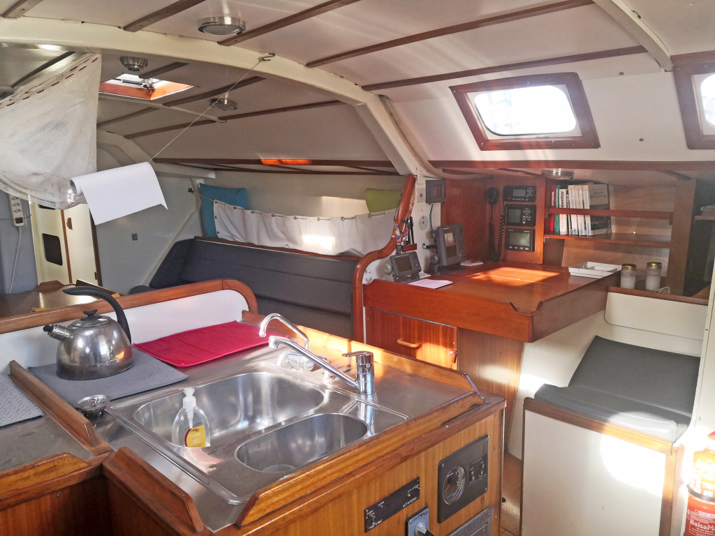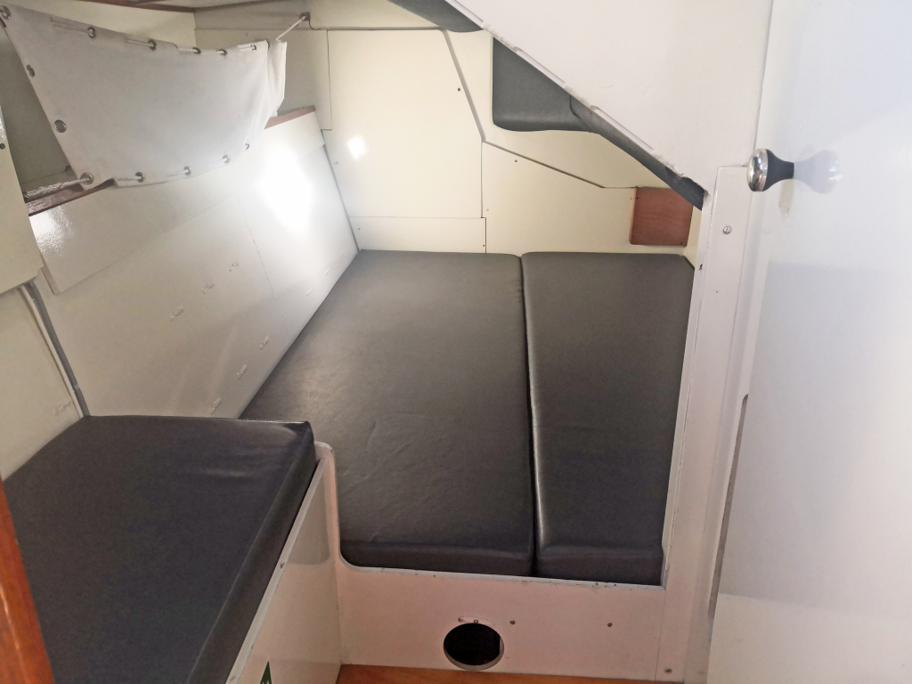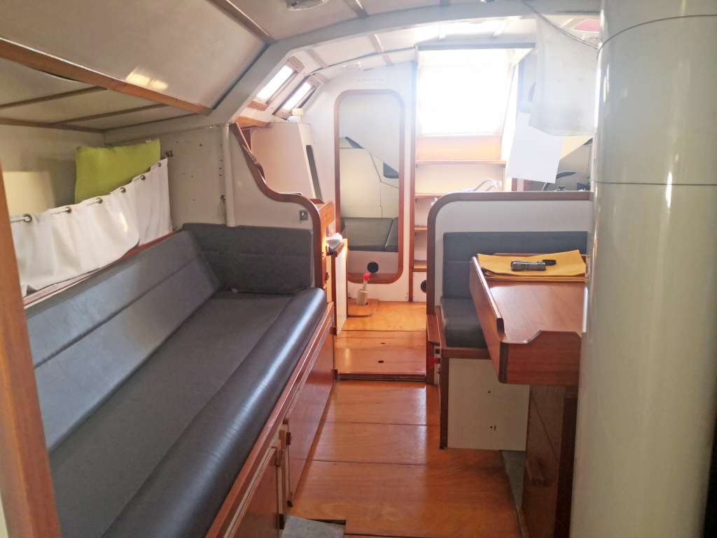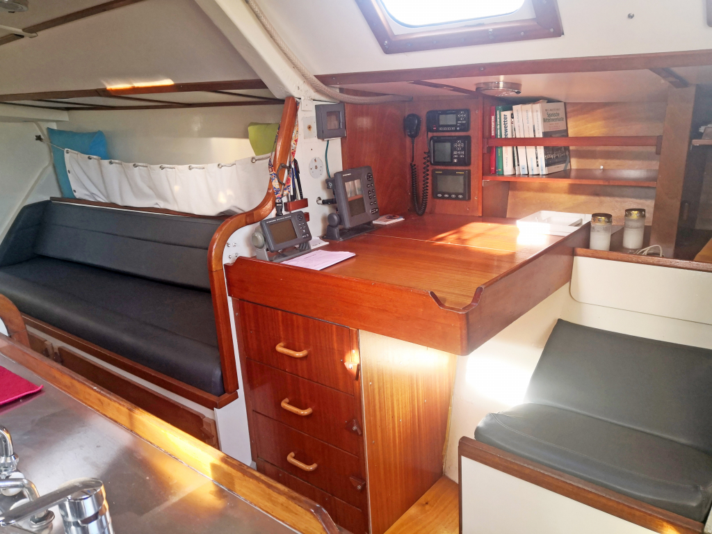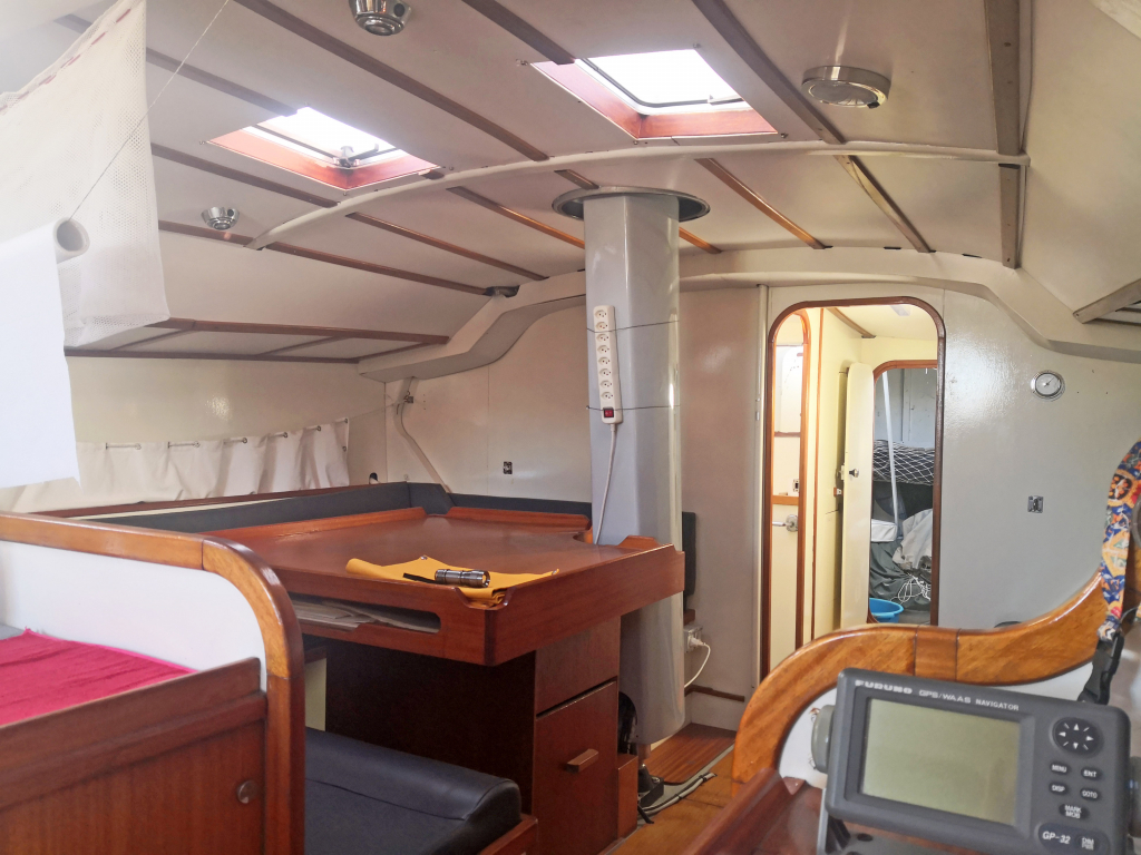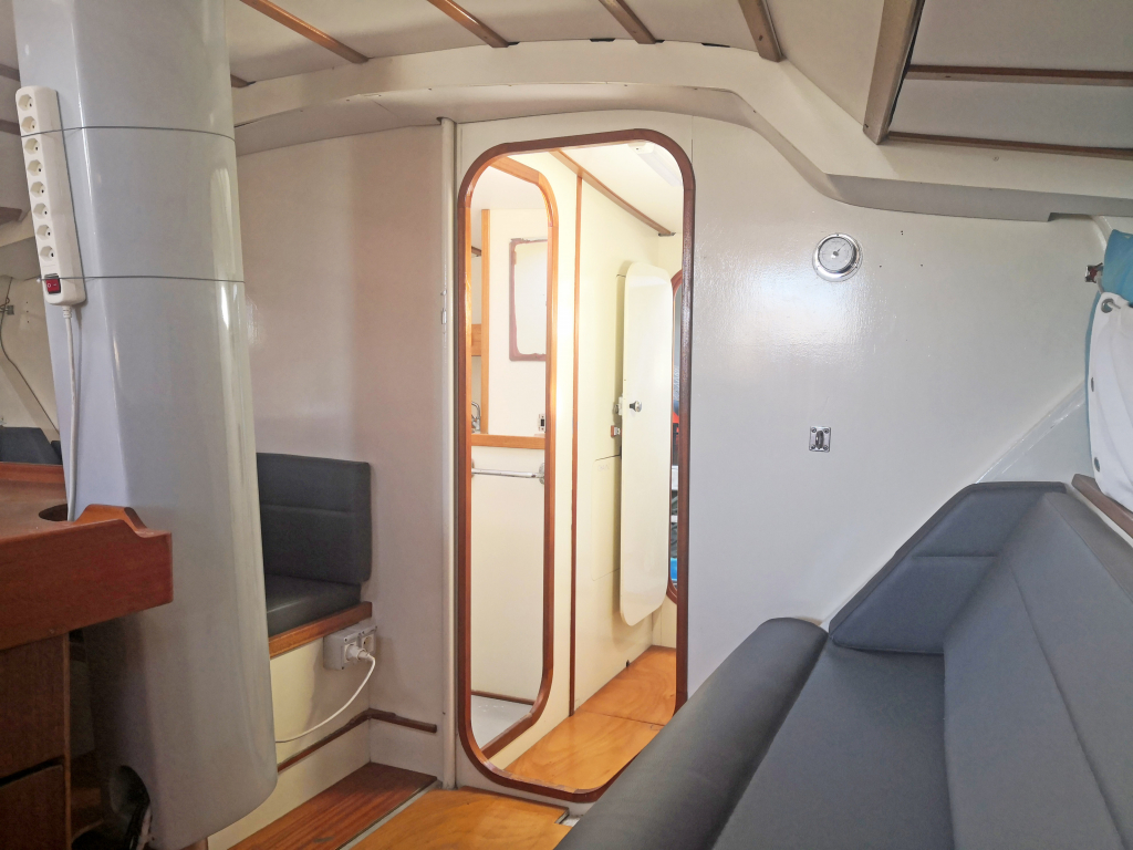 ACCOMODATION: Sleeps 6 in 2 cabins and saloon. Interior balsa-mahagoni wood. Partial insulation. Saloon with U shaped seating for 6 to starboard, additional sofa seating to port. Nav station to port aft and galley to starboard aft. Galley with U shaped stainless steel worktops with built in single stainless steel sink with mixer tap. 2 Burner stove with oven. 80L Top loading refrigerator (convertible into freezer). Full kitchen inventory. Aft cabins: double bed with hanging locker and cupboard storage. Head: Jabsco toilet, washbasin with mixer tap. Shower with shower pump. Lots of storage. Water 2x175L. Holding tank 60L. Electric and manual bilge pump. Additional moveable electric bilge pump.