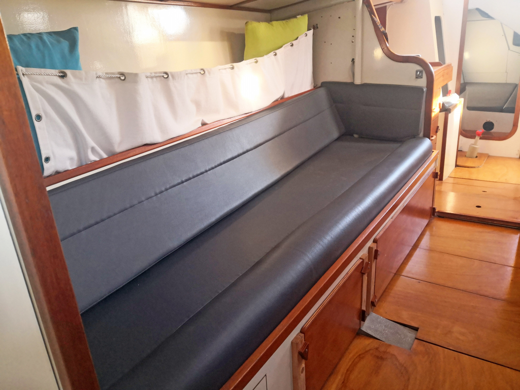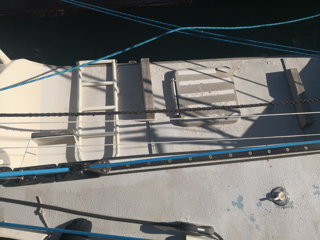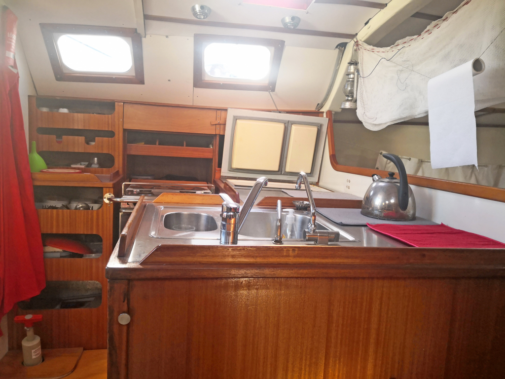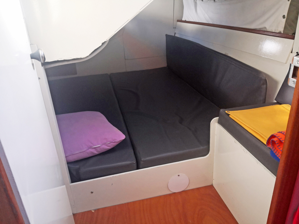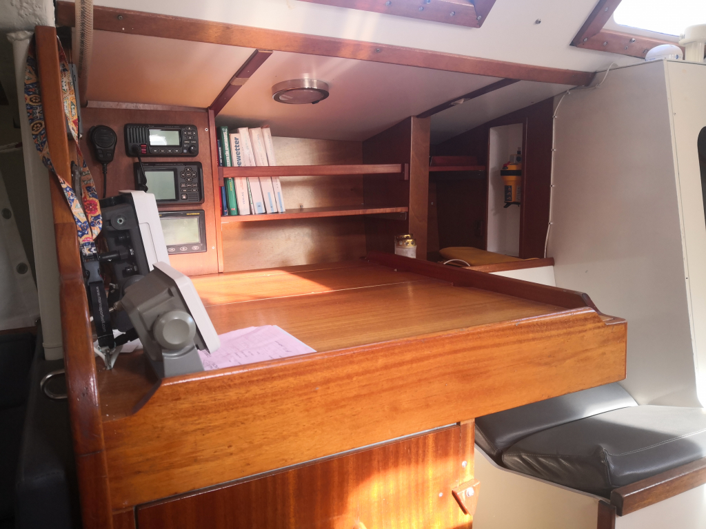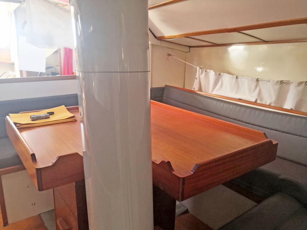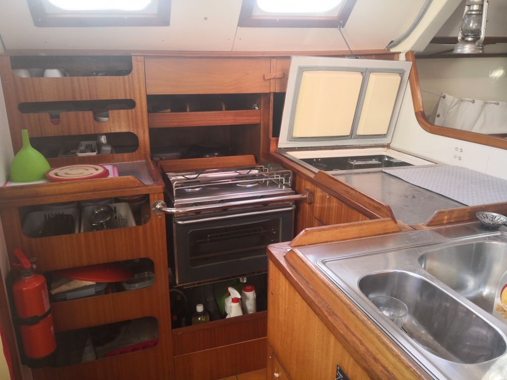 ACCOMODATION: Sleeps 6 in 2 cabins and saloon. Interior balsa-mahagoni wood. Partial insulation. Saloon with U shaped seating for 6 to starboard, additional sofa seating to port. Nav station to port aft and galley to starboard aft. Galley with U shaped stainless steel worktops with built in single stainless steel sink with mixer tap. 2 Burner stove with oven. 80L Top loading refrigerator (convertible into freezer). Full kitchen inventory. Aft cabins: double bed with hanging locker and cupboard storage. Head: Jabsco toilet, washbasin with mixer tap. Shower with shower pump. Lots of storage. Water 2x175L. Holding tank 60L. Electric and manual bilge pump. Additional moveable electric bilge pump.
