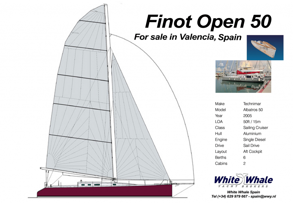 Finot-Conq designed Open 50 (2005) aluminium cruiser/racer located in Valencia, Spain. Well maintained and hardly used during last 10 years. Prepared for ocean regattas/crossings and equipped with extra water ballasts tanks to improve healing angle and sailing comfort. Competitive racer and comfortable cruiser (6 berths in 3 cabins). Easy to handle by short-handed crew and able to reach speeds up to 15 knots. Electronics 2015 and complete sailing wardrobe with trinquete, 2 gennakers and 1 spinnaker. Volvo Penta D2-40F engine with only 1.500 engine hours. Full maintainance and upgrade history available. Swiss flag. For all info and viewings contact Frans Bennekers of White Whale Spain Yacht Brokers on tel +34 629 979 667, email spain@wwy.nl.