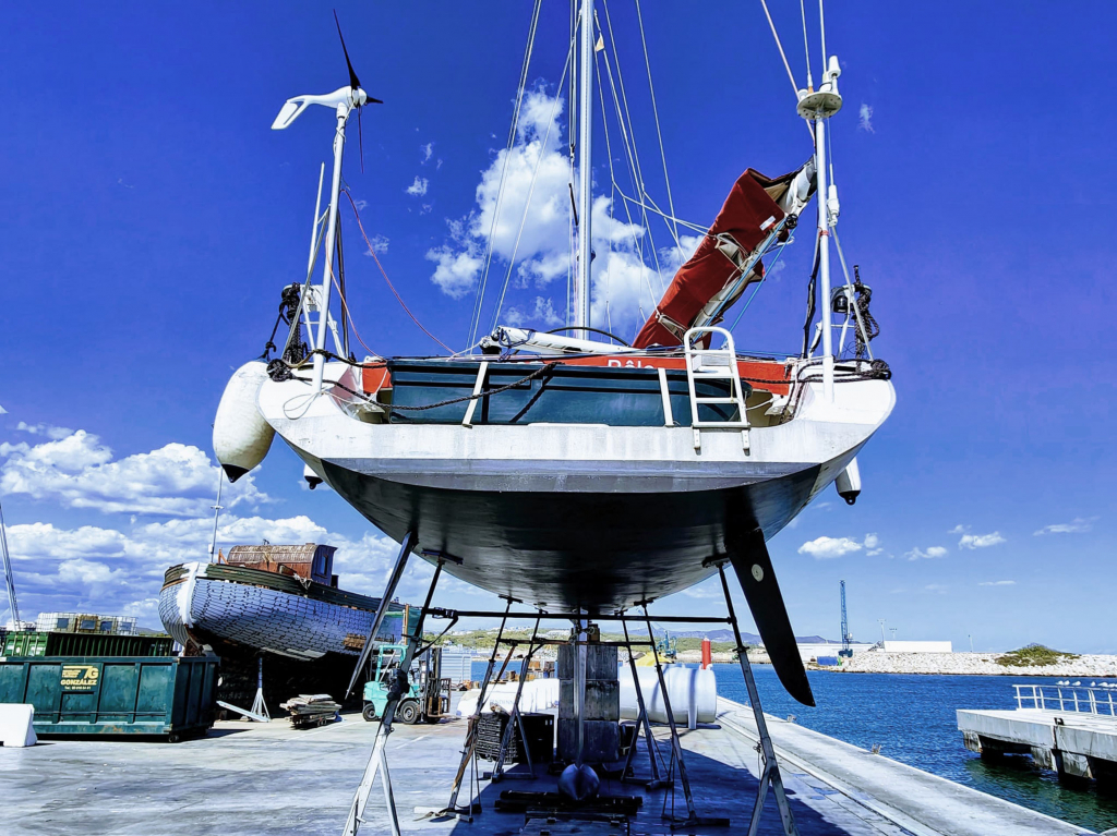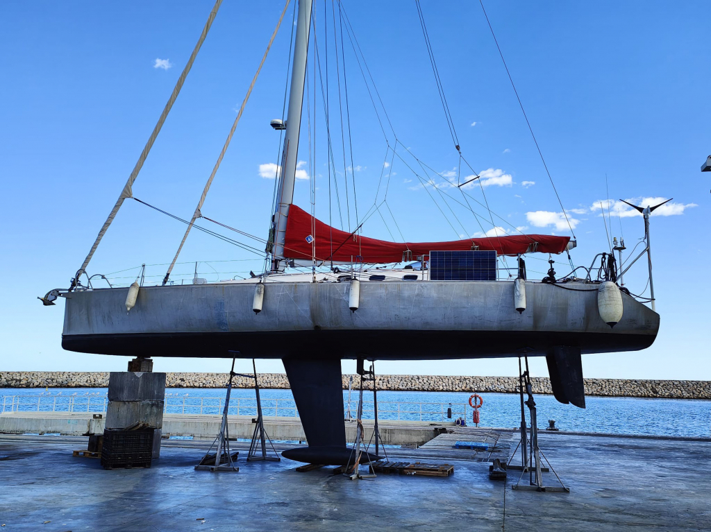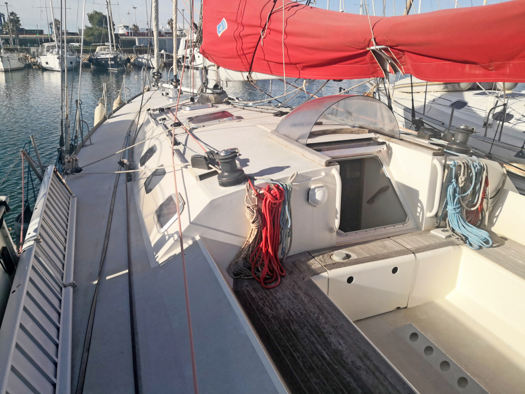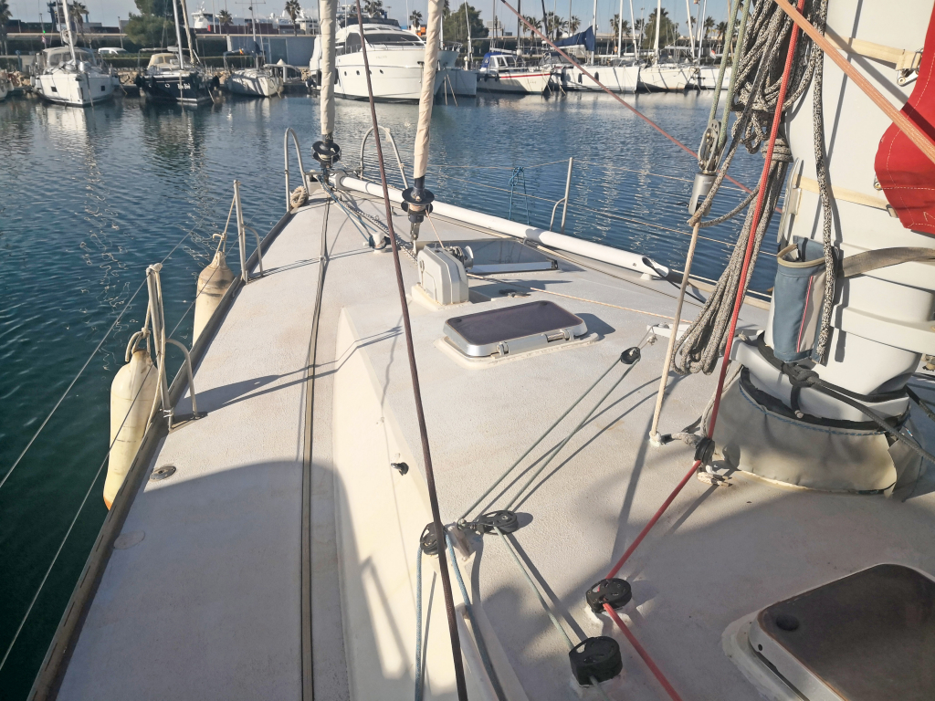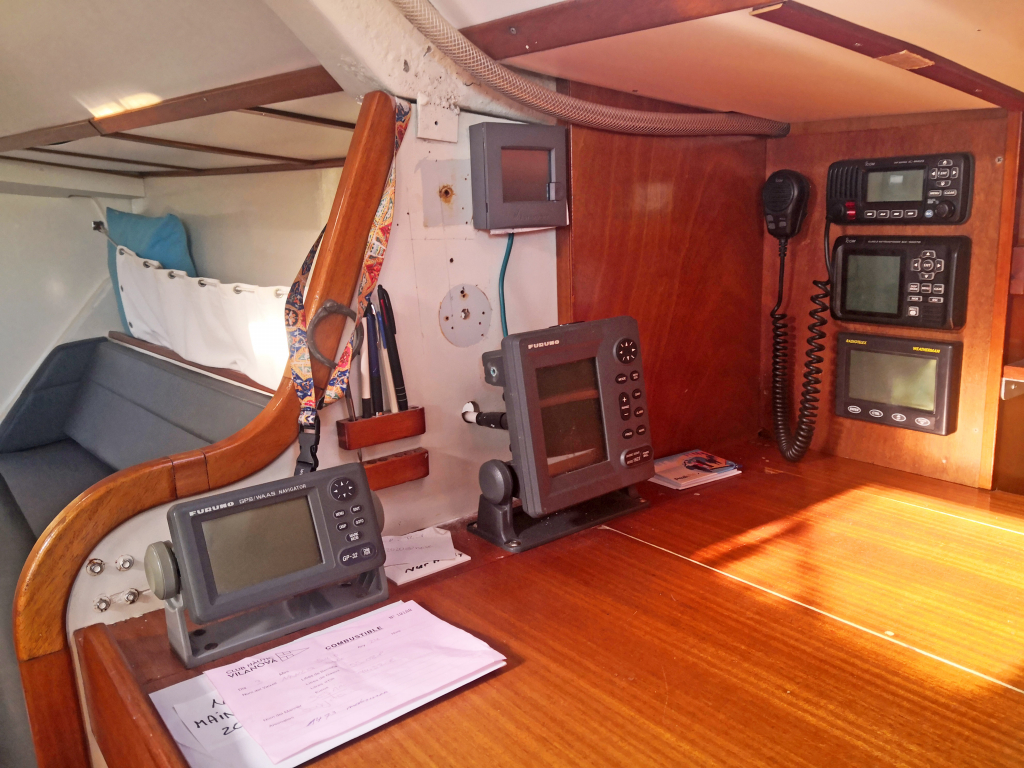 ELECTRONICS AND EQUIPMENT: 2 independent NKE autopilots. Icom VHF Radio. Furuno GPS/AIS/Navtex/ Weatherman receiver. Martec radar echo amplifier. Mast jack hydraulic pump. Very complete tools and spare parts, including electric grinder for mast stays in case of problem. Iridium antenna. Main anchor Spade 30Kg with 40M chain and 70M rope stored aft close to mast foot. Second anchor Fortress with 30M chain and 100M rope. Suncover over cockpit and main part of saloon.