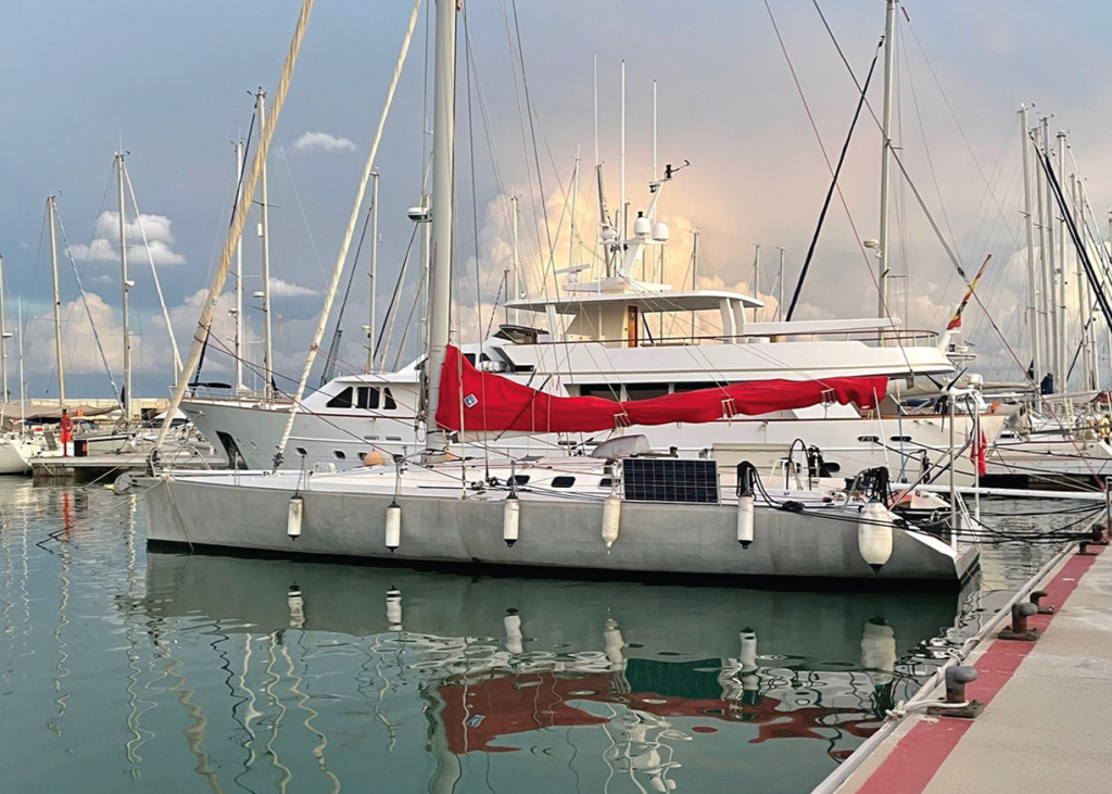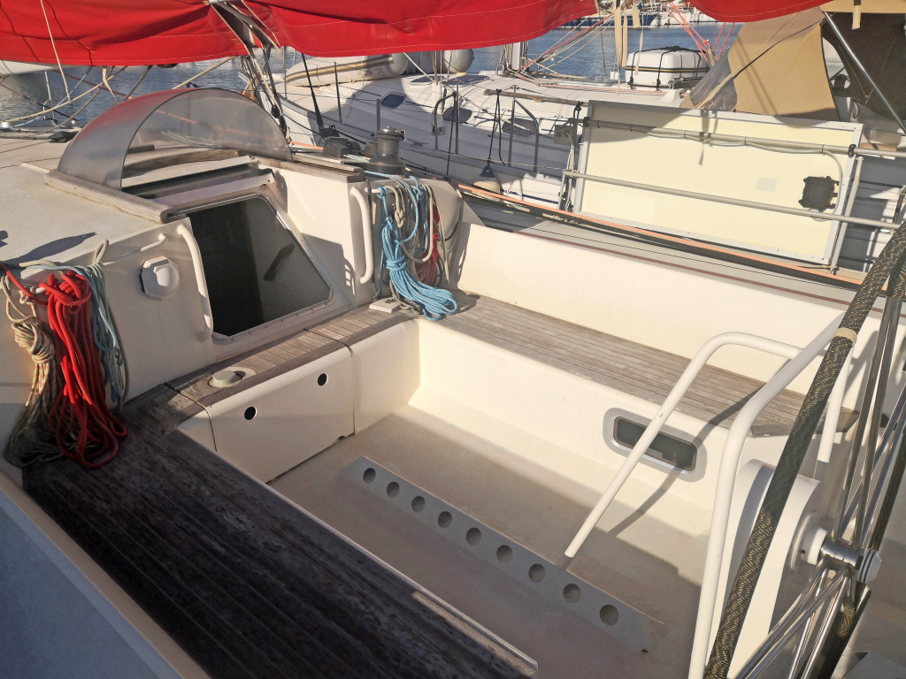 CONSTRUCTION: Built by Technimar St Malo in France in 2005. Aluminium construction, deck 3mm, bottom 10mm. 3M Deep fin keel with 3,5T lead bulb. Twin rudders. 2.2T water ballast on each side with electric pump filling, transfer by gravity, to obtain ideal 15 degree healing angle. Teak in cockpit. Stern platform housing for hard shell dinghy, giving direct access to water. Single wheel in stainless steel (covered in nylon cord).