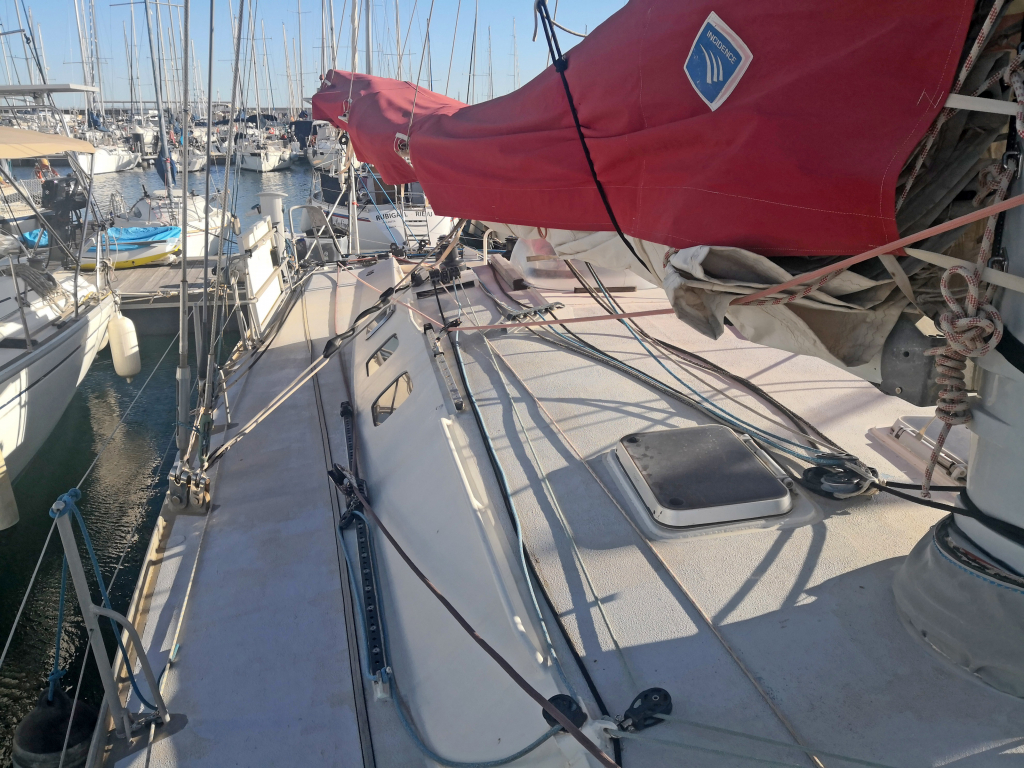 RIGGING AND SAILS: Bermudian sloop. C-Wing rigging (no spreaders) with carbon rotating mast and aluminium boom. Carbon bow sprit 2M for gennaker and spinnaker. Stainless steel dyform rigging (2017). Complete running rigging in dyneema. Assimetric spinnaker. Incidence sails (2016), hardly used. Full batten mainsail 100 sqm by Incidence, reefing lines to cockpit. Genoa 57 sqm by Incidence on Facnor furler. Trinquette 25 sqm on Facnor furler. Furling gennaker. 2 Asymetric spinnakers (light and heavy), both in sock.
