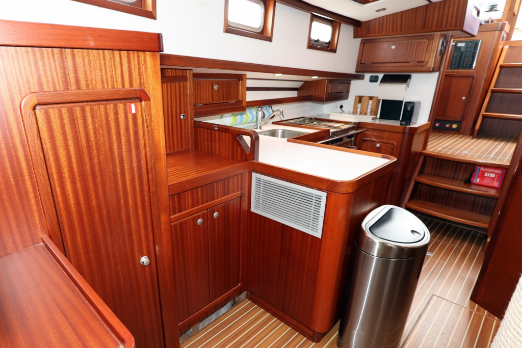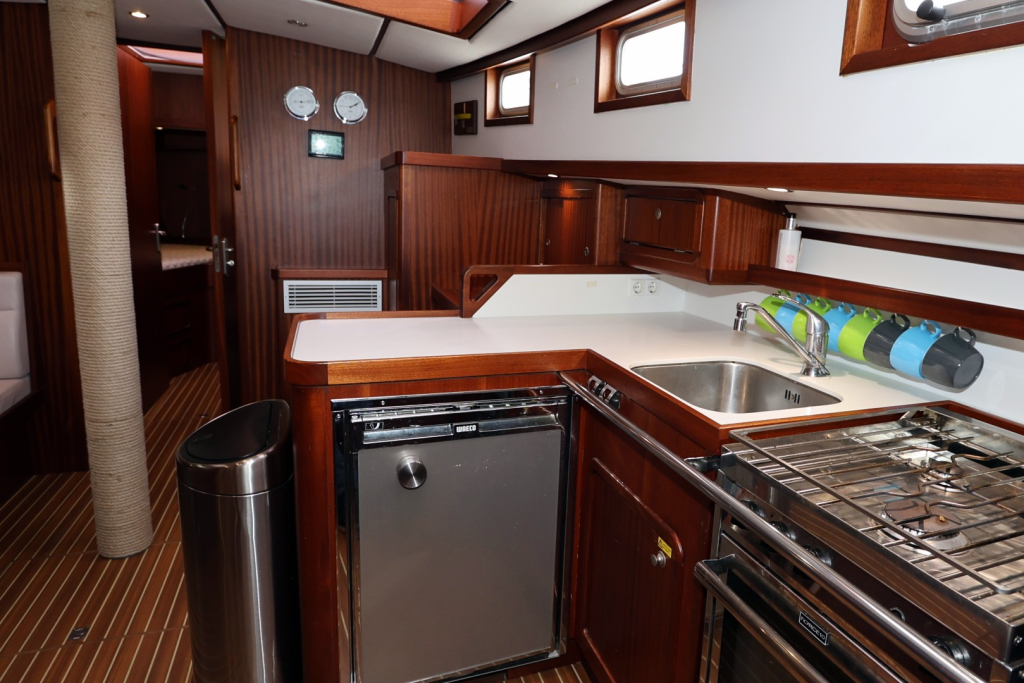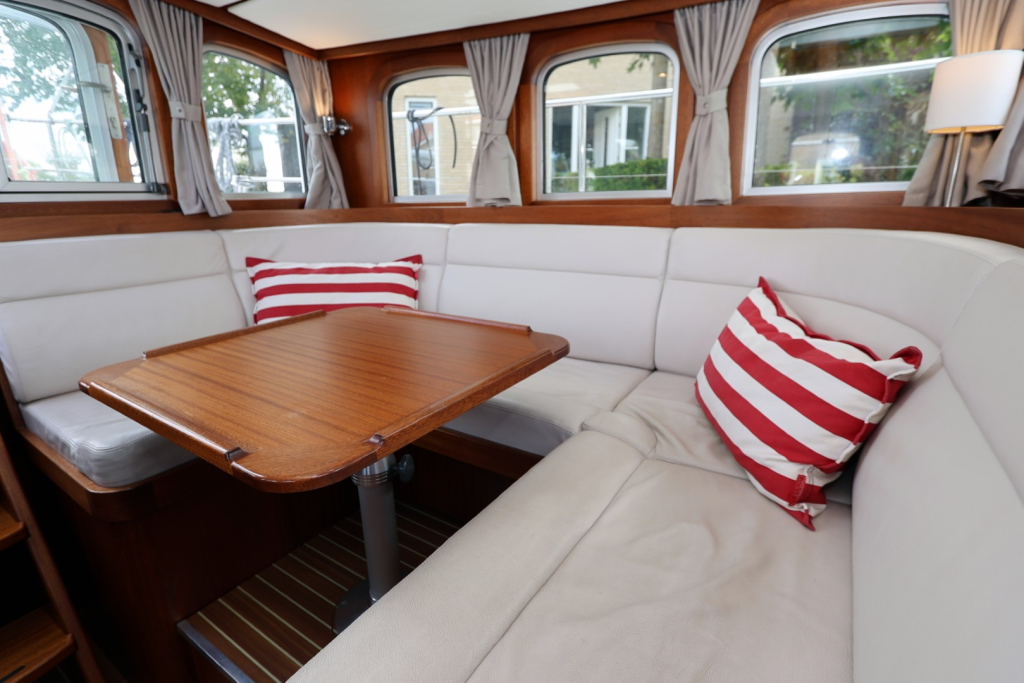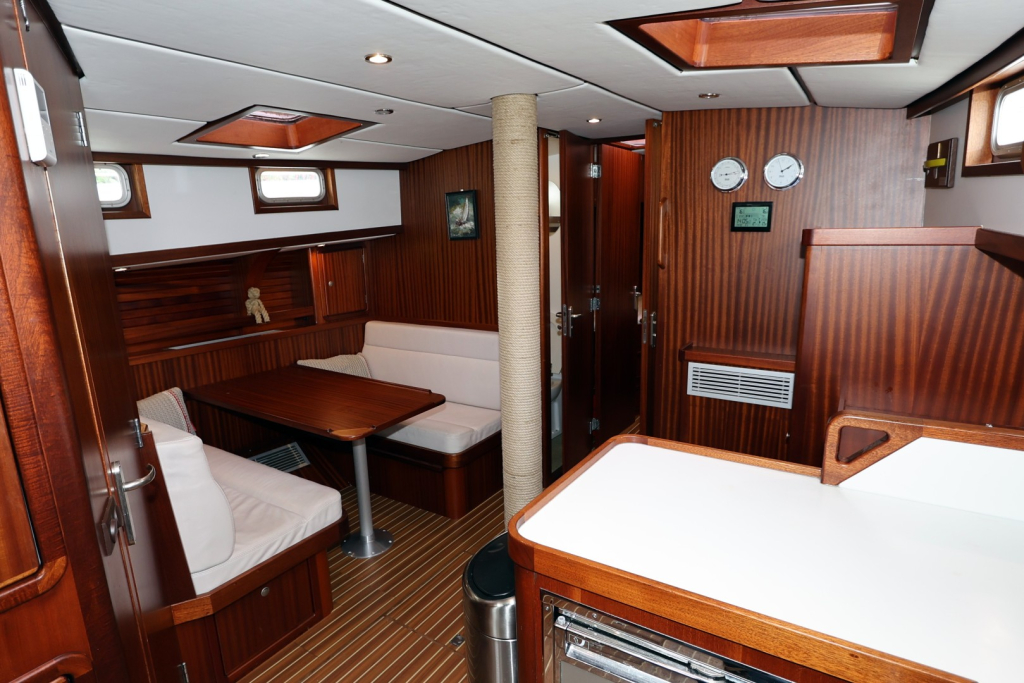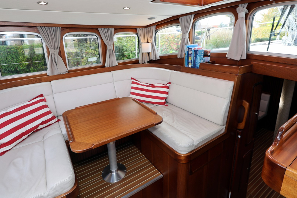 Het ruime stuurhuis is een kenmerkend element; met 360° zicht en voldoende zitruimte is het comfortabel varen in alle weersomstandigheden. Binnen biedt het jacht een warm houten interieur, een volledig uitgeruste kombuis, een ruime eigenaars hut met natte cel, en een gastenhut. De stahoogte bedraagt circa 1,95 meter. Dankzij de goede isolatie en verwarming is dit schip geschikt voor zowel poolgebieden als tropische bestemmingen.