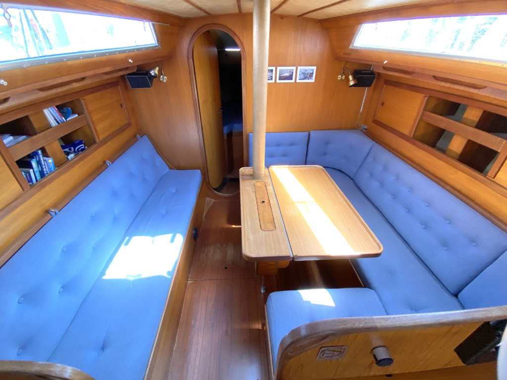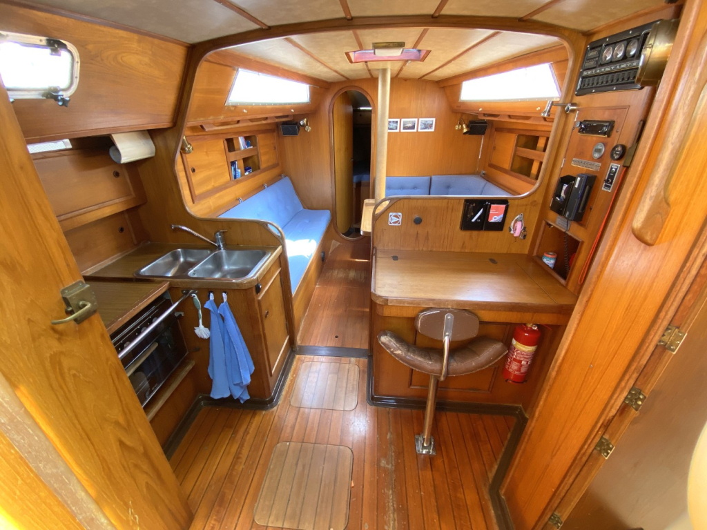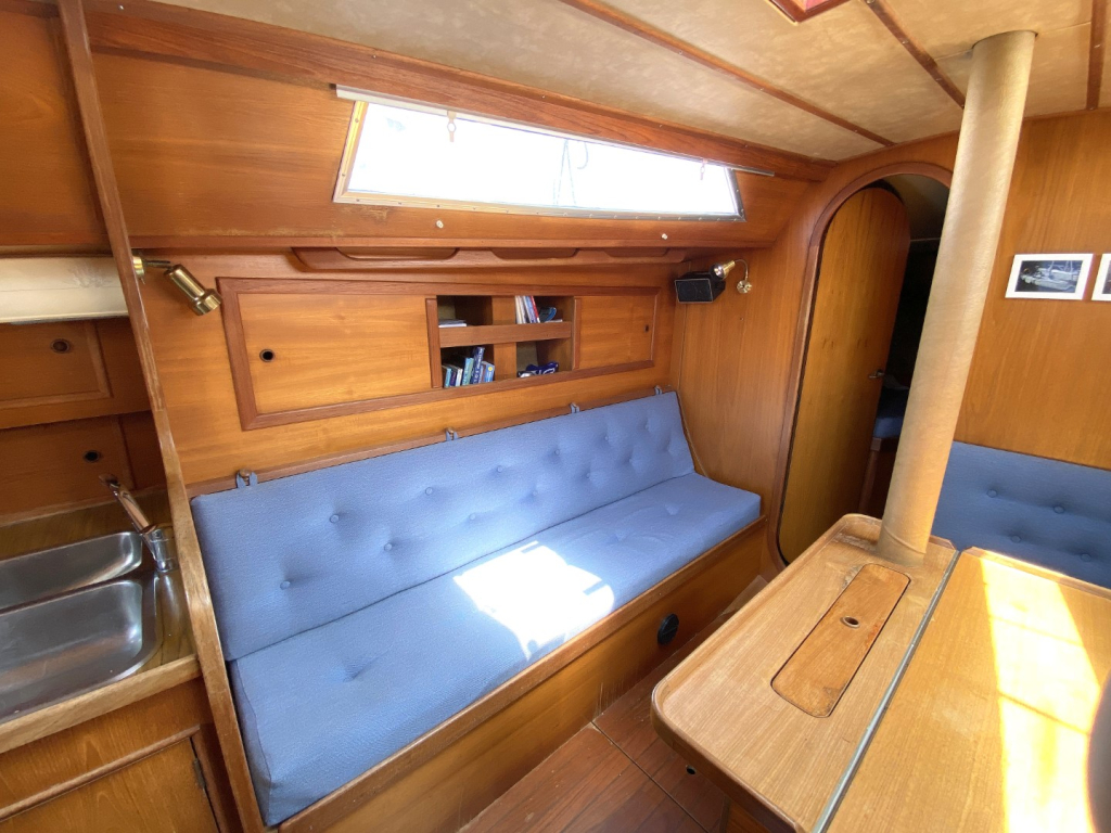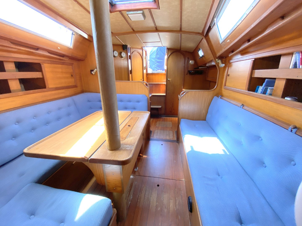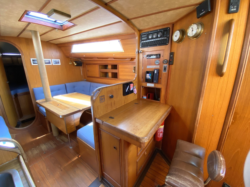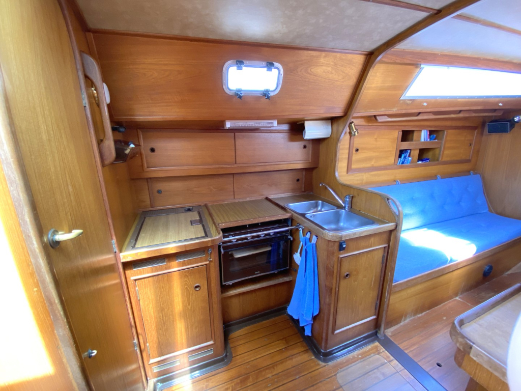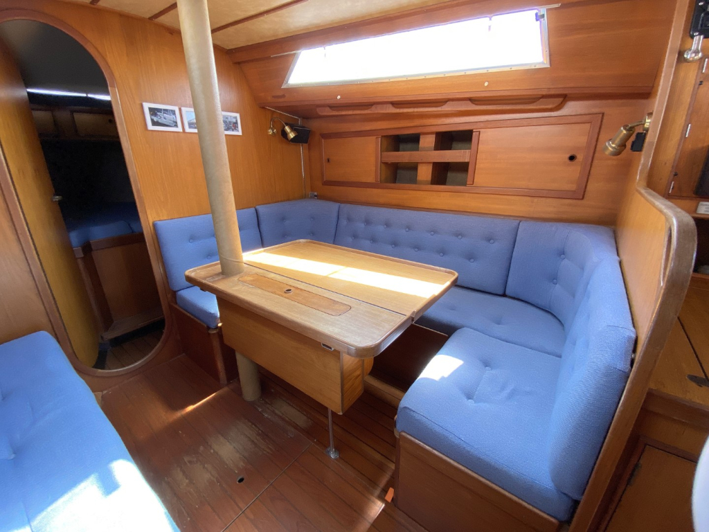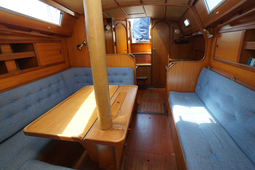 Binnen in het schip valt direct de warme nautische sfeer op, dankzij het rijkelijke gebruik van massief hout en een slimme indeling die ruimte optimaal benut. De salon is gezellig en licht, met comfortabele zitbanken (met in 2023 vernieuwde bekleding) en een royale tafel voor aangename avonden aan boord. De kombuis is compleet uitgerust met een gasfornuis, oven en spoelbak, en biedt voldoende kastruimte voor langere tochten. De Dehler beschikt over twee hutten en zeven slaapplaatsen in totaal, waarmee ze perfect is voor langere reizen met meerdere opvarenden. De natte cel is ruim en functioneel ingericht, met toilet, wasbak en een douche.