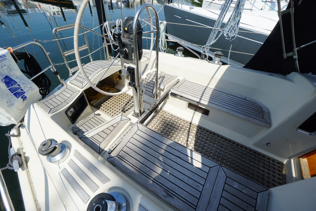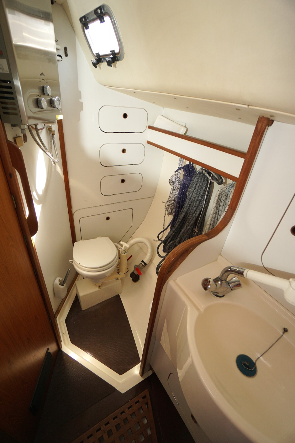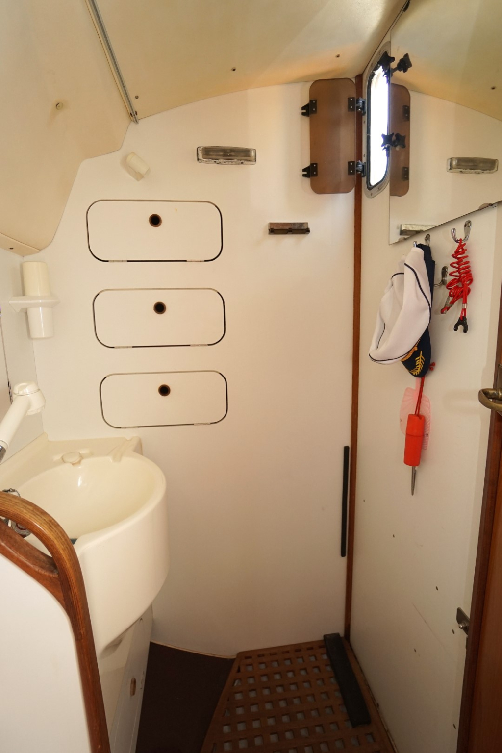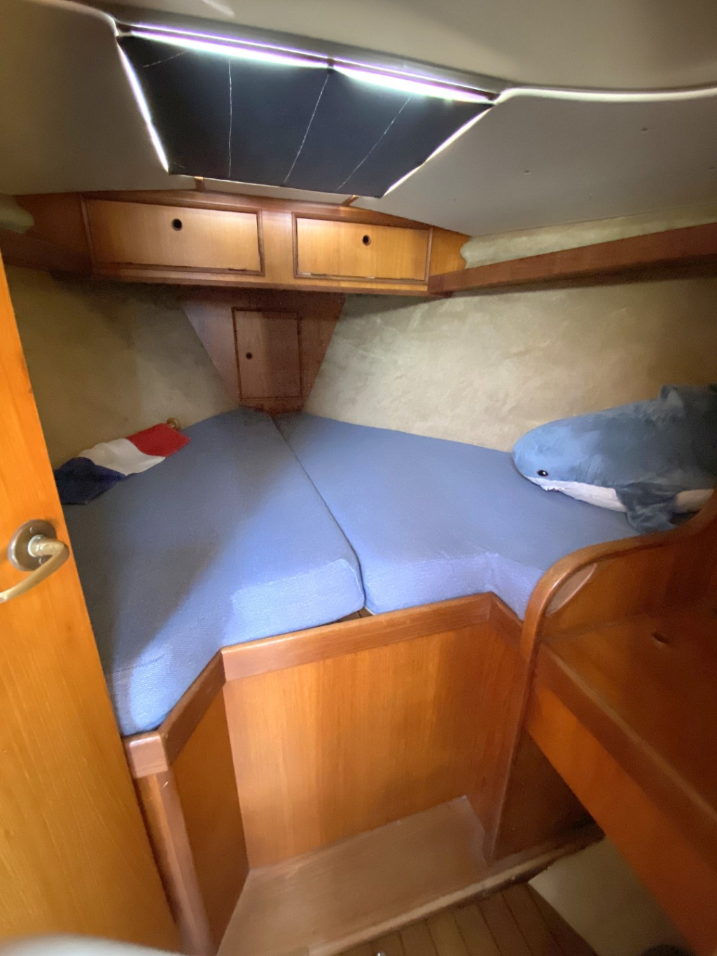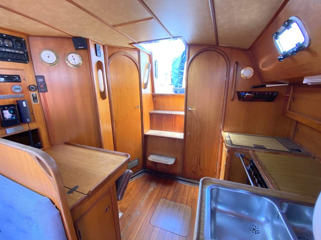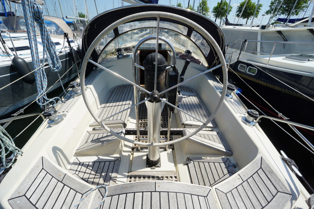Binnen in het schip valt direct de warme nautische sfeer op, dankzij het rijkelijke gebruik van massief hout en een slimme indeling die ruimte optimaal benut. De salon is gezellig en licht, met comfortabele zitbanken (met in 2023 vernieuwde bekleding) en een royale tafel voor aangename avonden aan boord. De kombuis is compleet uitgerust met een gasfornuis, oven en spoelbak, en biedt voldoende kastruimte voor langere tochten. De Dehler beschikt over twee hutten en zeven slaapplaatsen in totaal, waarmee ze perfect is voor langere reizen met meerdere opvarenden. De natte cel is ruim en functioneel ingericht, met toilet, wasbak en een douche.