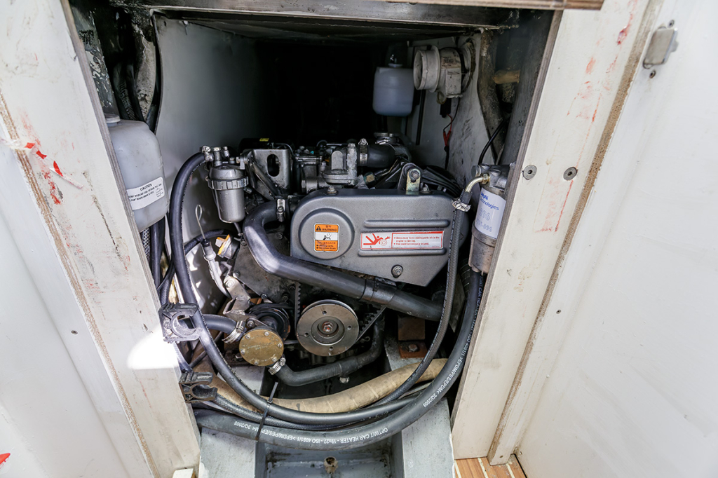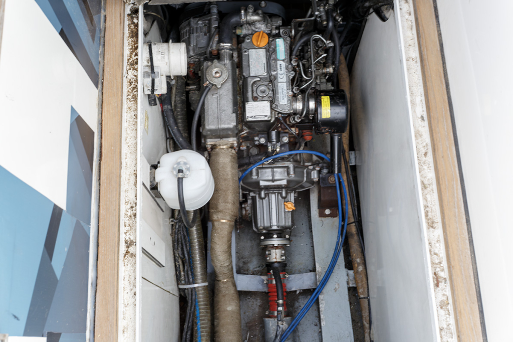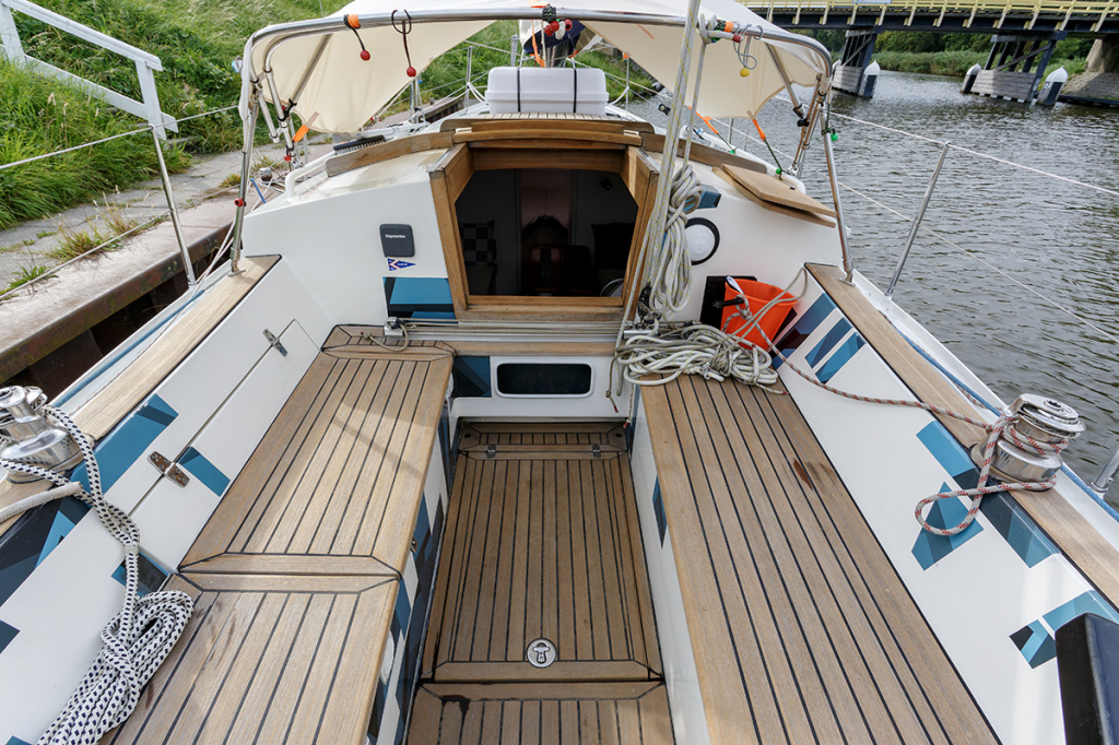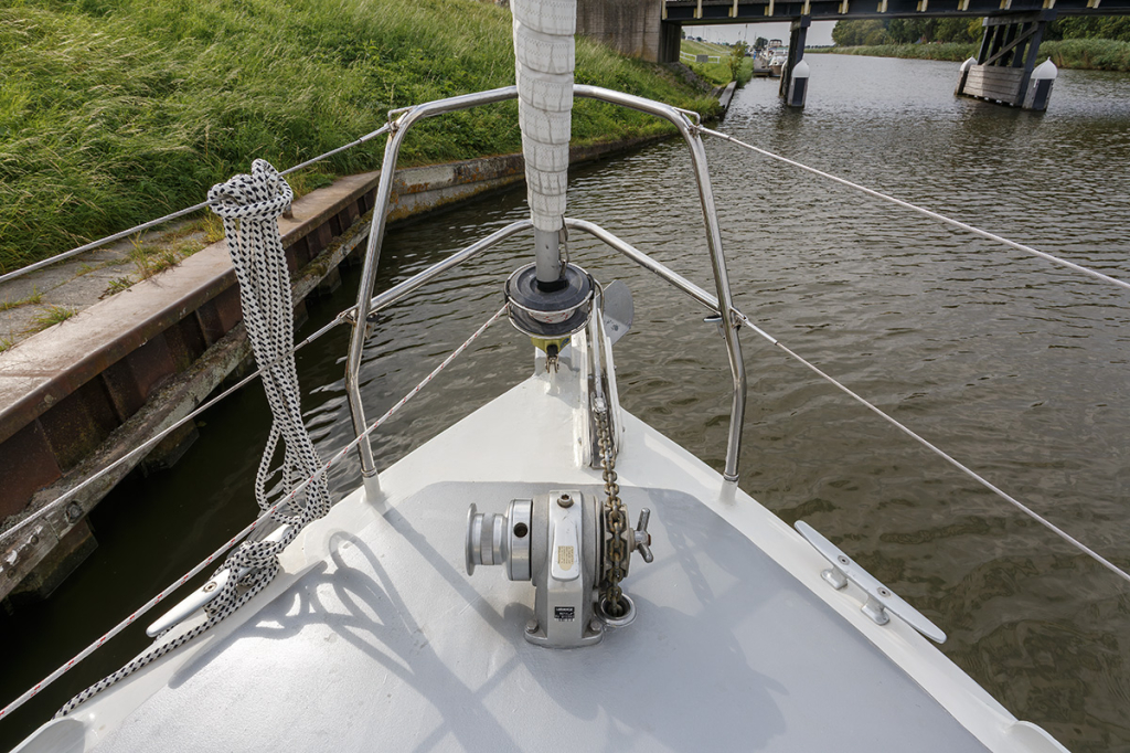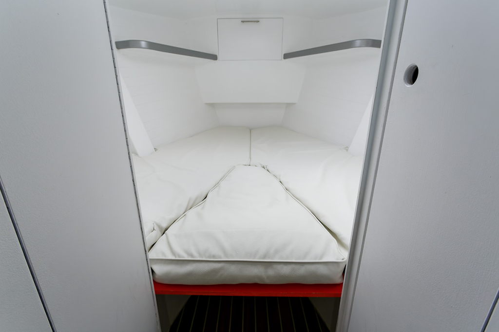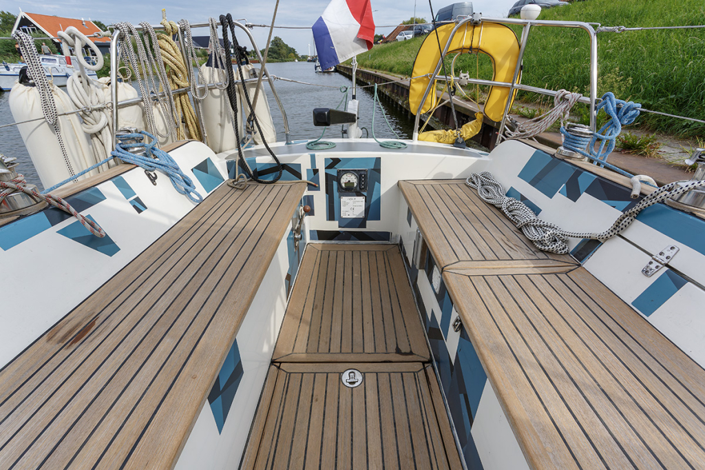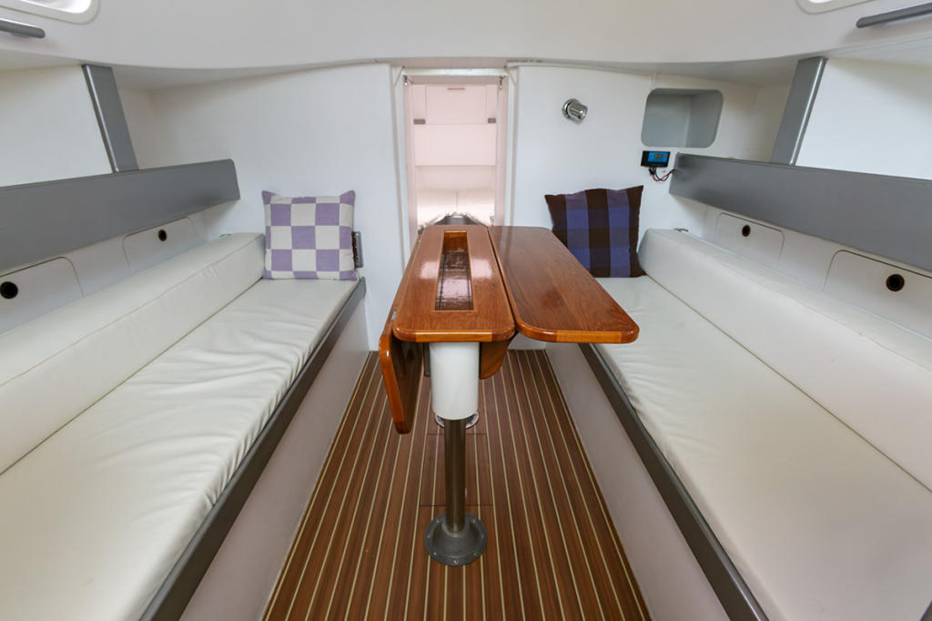 Het interieur is no-nonsense solide timmerwerk en goede stoffering. De lichte kleurstelling werkt mee aan de ruimtelijke beleving en heerst er een gezellige nautische sfeer in de salon. Bij binnenkomst is direct aan bakboord de kombuis met 2-pits kookstel en spoelbak. Aan stuurboord is de navigatiehoek. In de punt is een hut met een dubbel bed en de benodigde opbergruimte. Er is bakboord een toiletruimte met onderwater toilet met vuilwatertank.