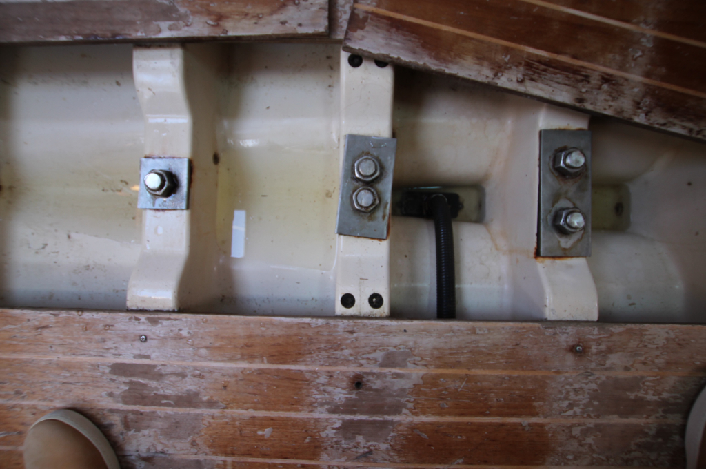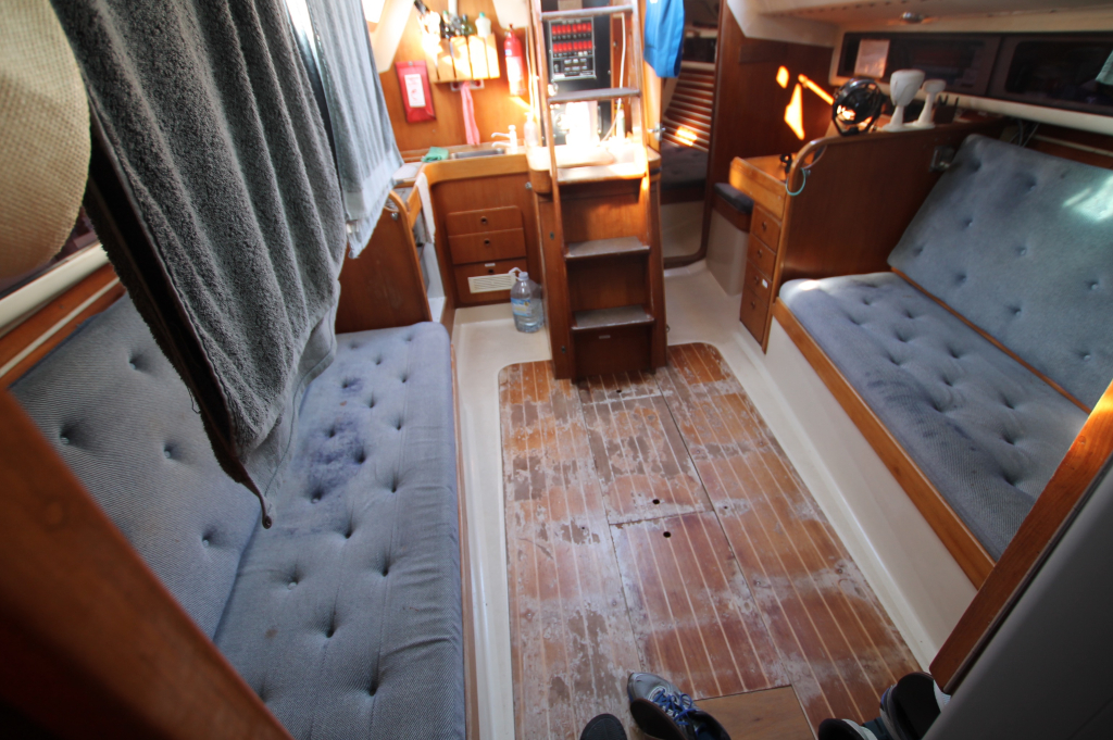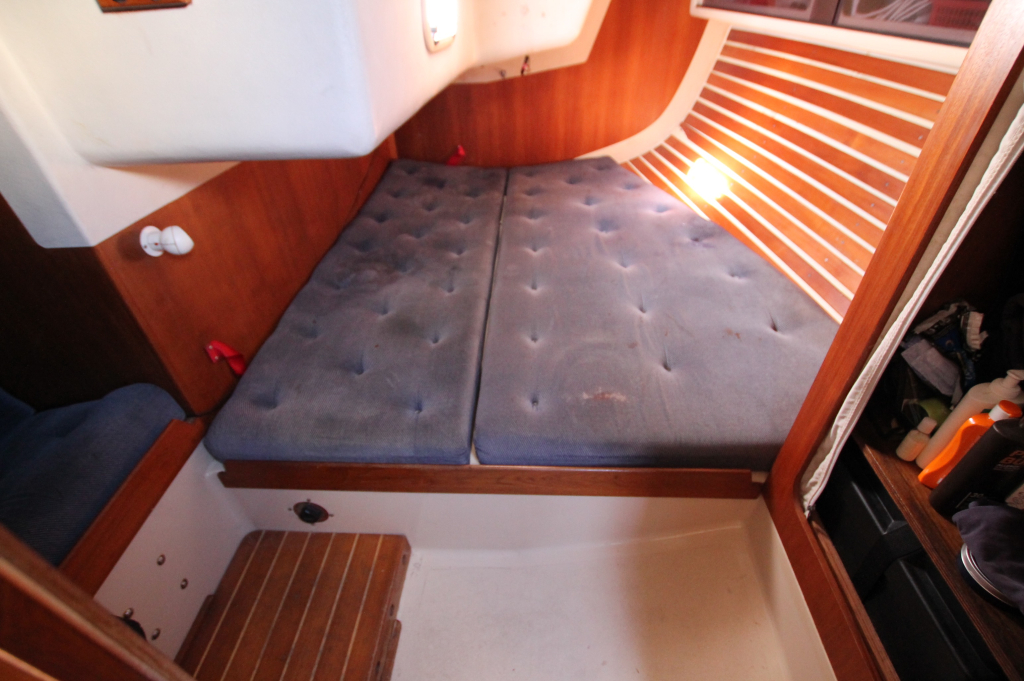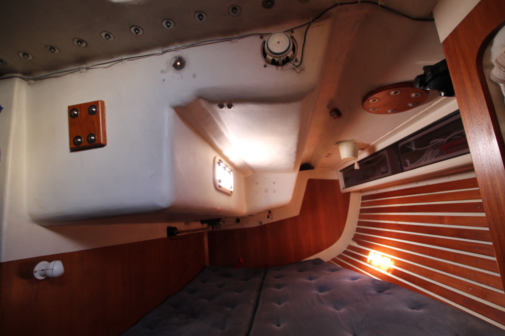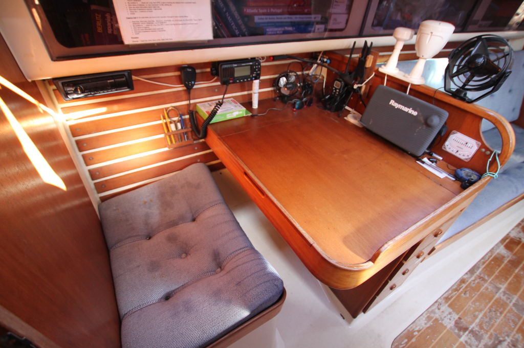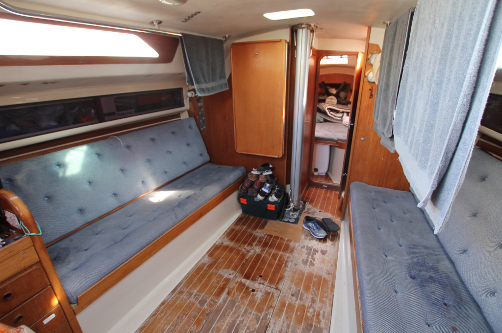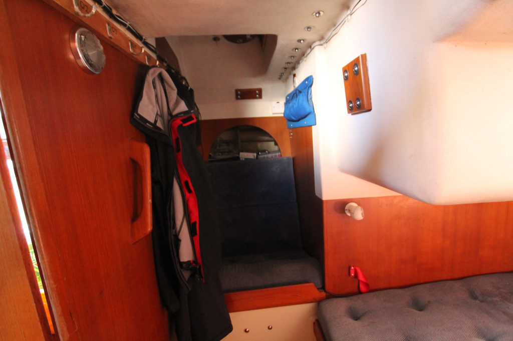ACCOMMODATION: Eight berths in three cabins, Interior of teak and teak faced ply, teak and holly cabin sole, Upholstery of blue cloth, lee cloths on sea berths, Forecabin with “V” berth and bureau, Heads with wash basin and ITT Par Sea toilet, Hanging wet locker, Saloon with two settee berths and two pull out root berths, Saloon table stored vertically against bulkhead, Forward facing chart table to port, Port aft cabin with double berth, hanging lockers and seat