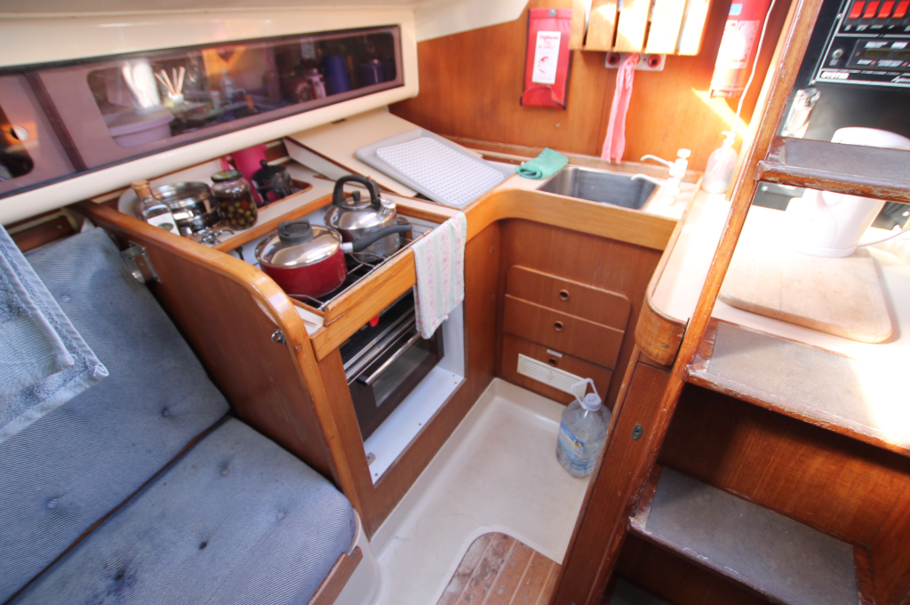 GALLEY: Stainless steel sink, Refrigerator / insulated coolbox (could need replacement), Gimbled gas stove with two burners, grill and oven, Stowage for crockery and cutlery, Fresh water pump, Sea water pump