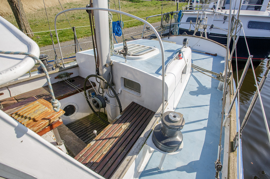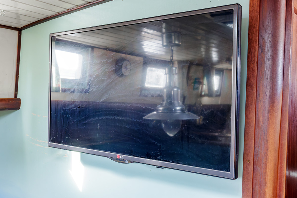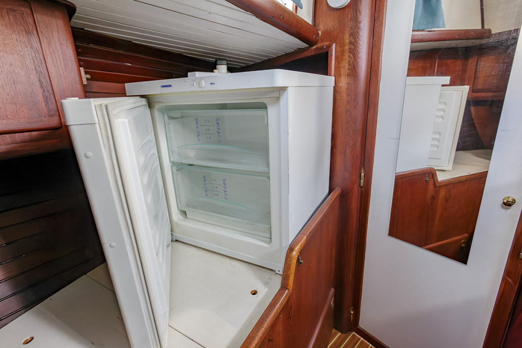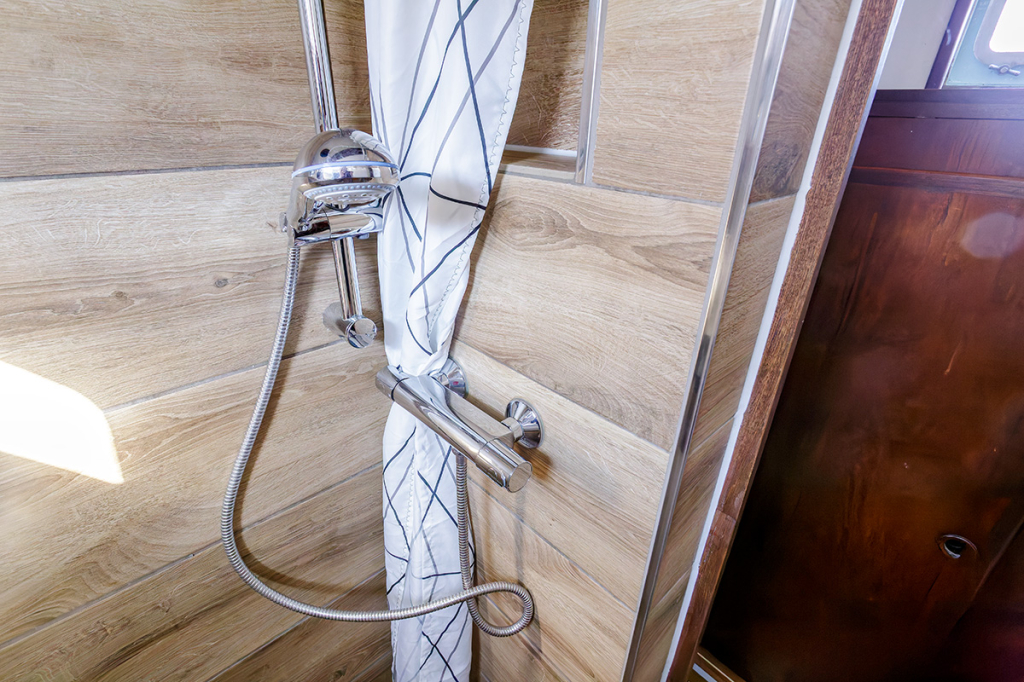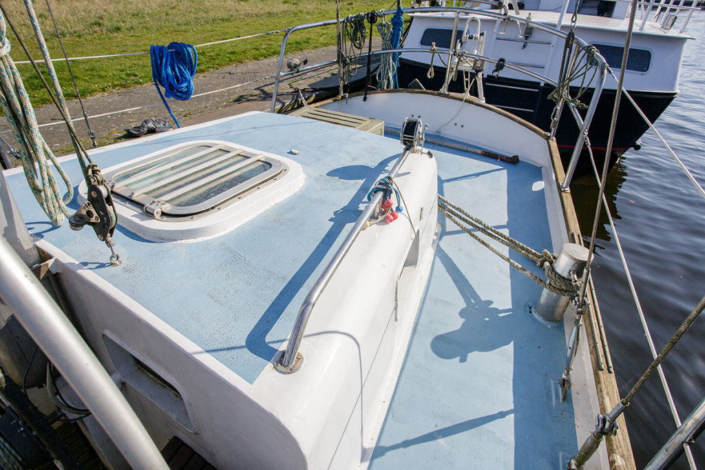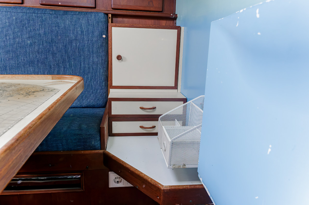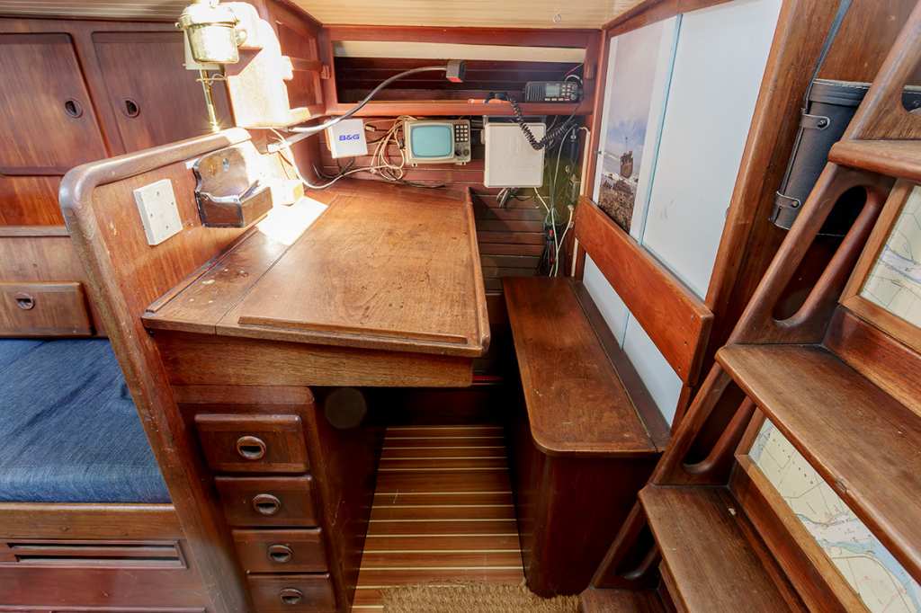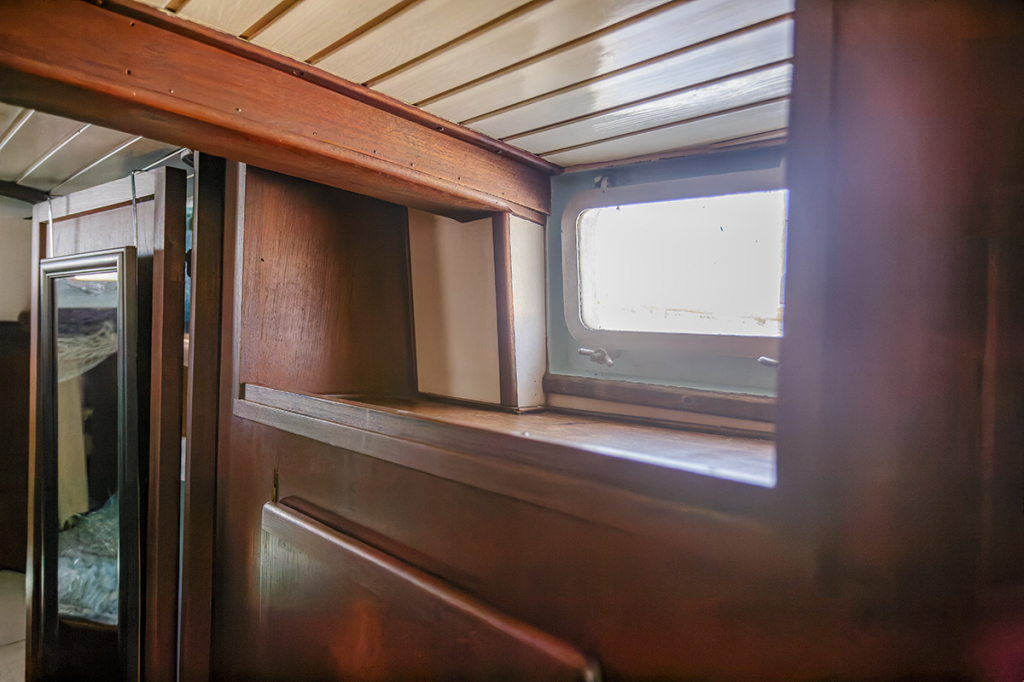 Het intérieur is in tweeën opgedeeld en is door de huidige eigenaar aangepast. De salon heeft een echte scheepse atmosfeer door het gebruik van donker teak en de vernieuwde vloer. Bij binnenkomst is links de L-vormige keuken, en rechts de navigatie hoek. Midscheeps is een ruime zithoek met banken rondom. Er is een diesel kachel met convectoren, zwaar genoeg om de hele boot te verwarmen. De voorhut met dubbel bed biedt plaats aan 2 personen. Bakboord voor is de badkamer met wastafel en elektrisch toilet op 12V. De achterhut, bereikbaar via een nieuw door de huidige eigenaar gemaakte doorgang is geschikt voor gasten/kinderen die daar een goede privé plek hebben.