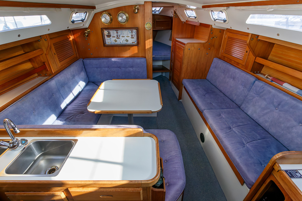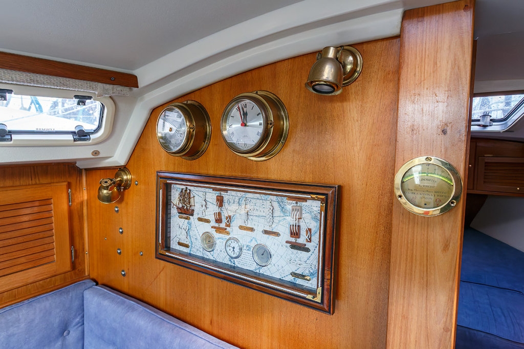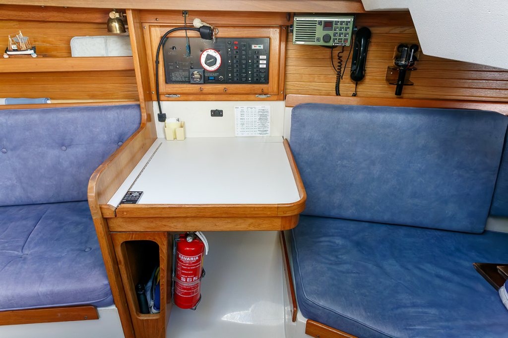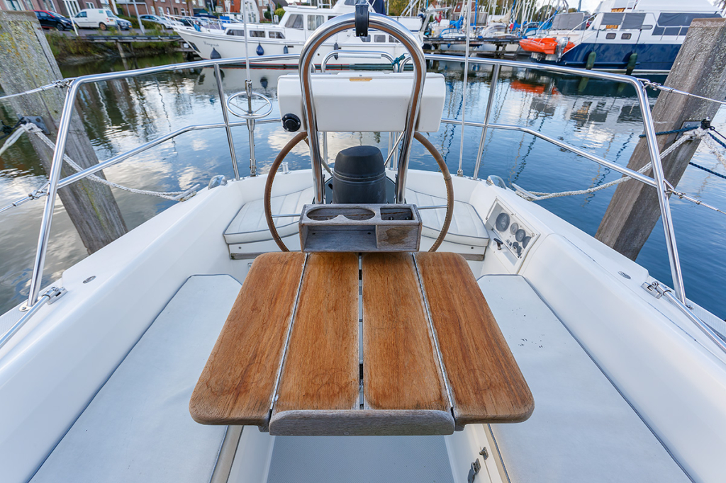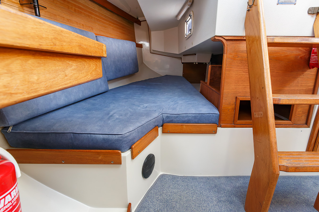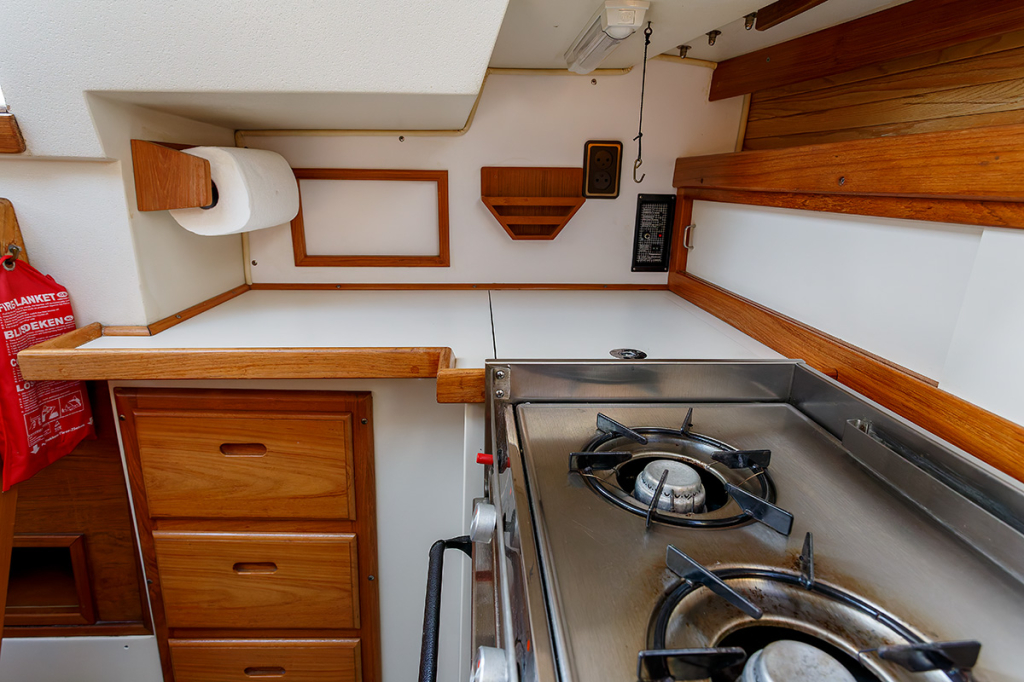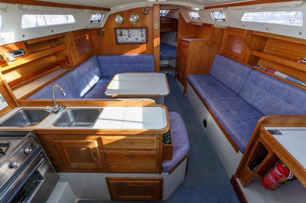 In het interieur valt meteen de praktische indeling en nautisch sfeer op met fraai teak houten aftimmering. De salon heeft een U-zit aan bakboord, een langsbank aan stuurboord met tafel midscheeps. De tafel is overigens te verlagen om zo een extra bed te creëren. Aan bakboord is een ruime kombuis, voorzien van rvs 2 pits kooktoestel met oven, koelkast, warm en koud water en de nodige opbergruimte. Aan stuurboord vind u de kaartentafel met het schakelpaneel voor de elektrische systemen. Bij de kaartentafel is ook de de toegang tot de kooi in het achterschip. Midscheeps aan bakboord is de natte cel met toilet en douche. In de voorpiek is een tweepersoons hut. Bekijk de volledige advertentie voor uitgebreide informatie.