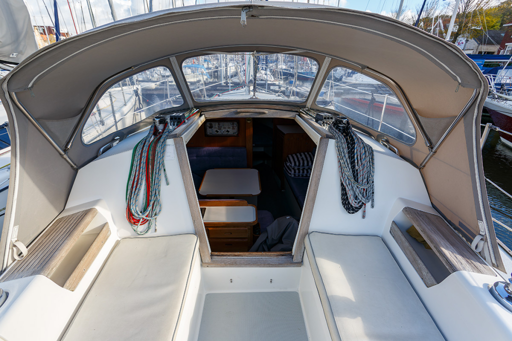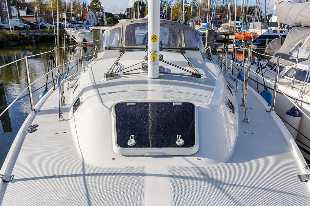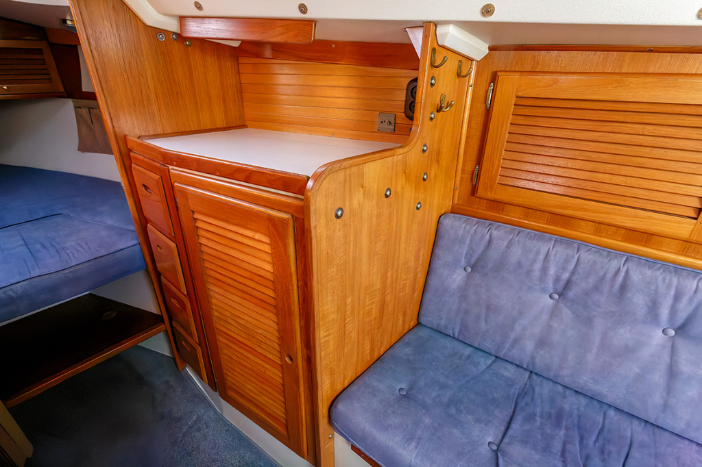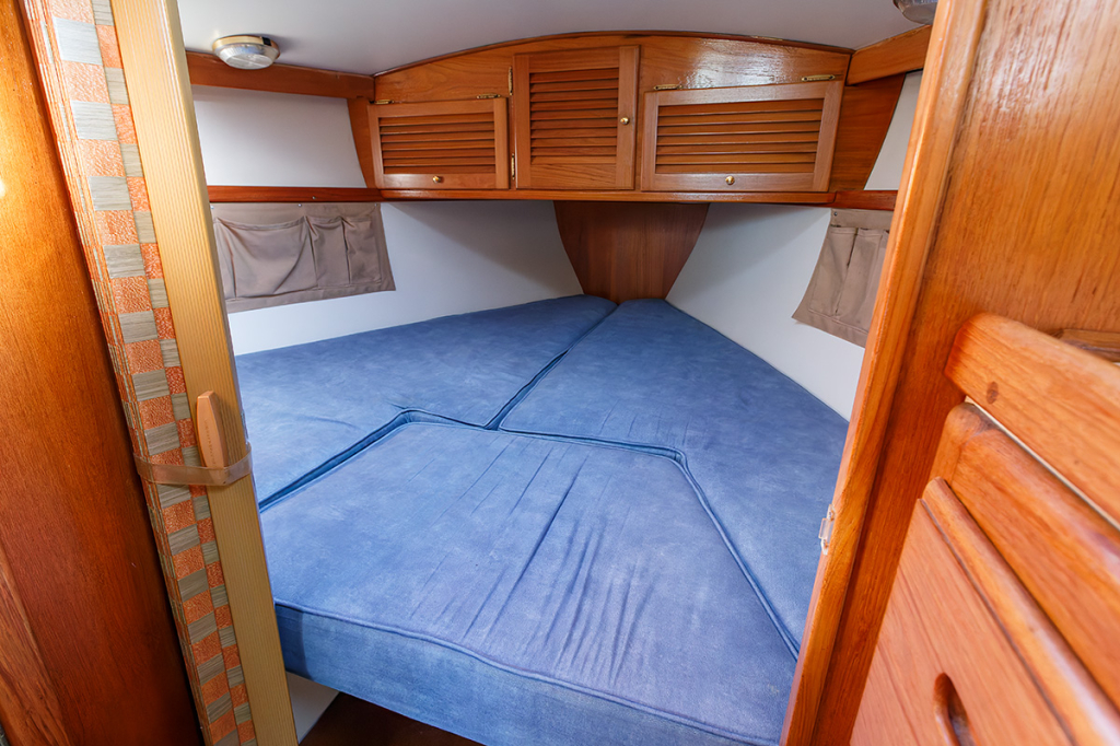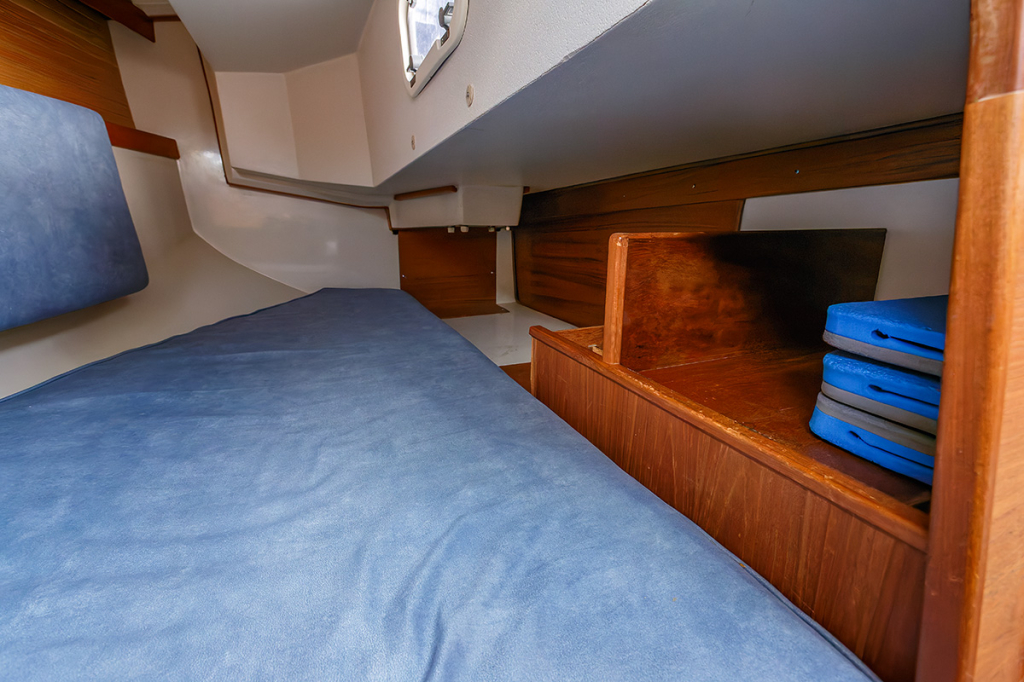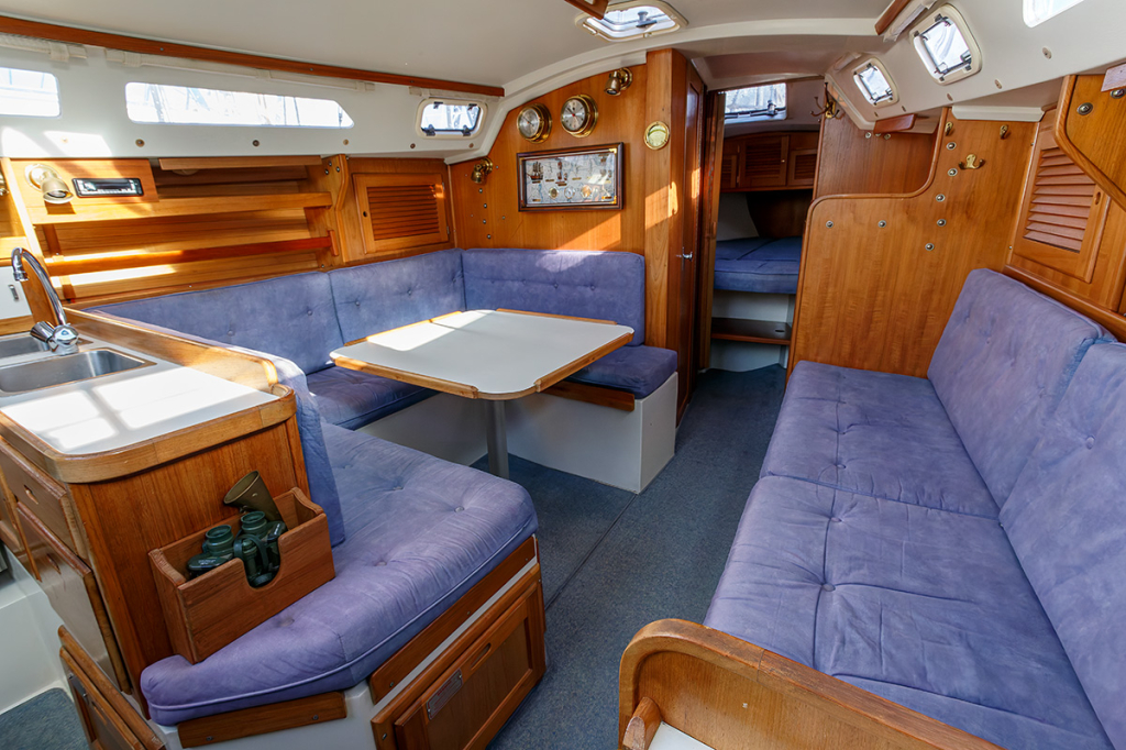 In het interieur valt meteen de praktische indeling en nautisch sfeer op met fraai teak houten aftimmering. De salon heeft een U-zit aan bakboord, een langsbank aan stuurboord met tafel midscheeps. De tafel is overigens te verlagen om zo een extra bed te creëren. Aan bakboord is een ruime kombuis, voorzien van rvs 2 pits kooktoestel met oven, koelkast, warm en koud water en de nodige opbergruimte. Aan stuurboord vind u de kaartentafel met het schakelpaneel voor de elektrische systemen. Bij de kaartentafel is ook de de toegang tot de kooi in het achterschip. Midscheeps aan bakboord is de natte cel met toilet en douche. In de voorpiek is een tweepersoons hut. Bekijk de volledige advertentie voor uitgebreide informatie.