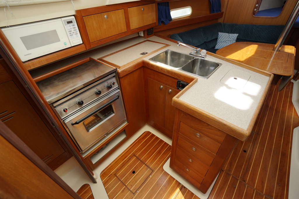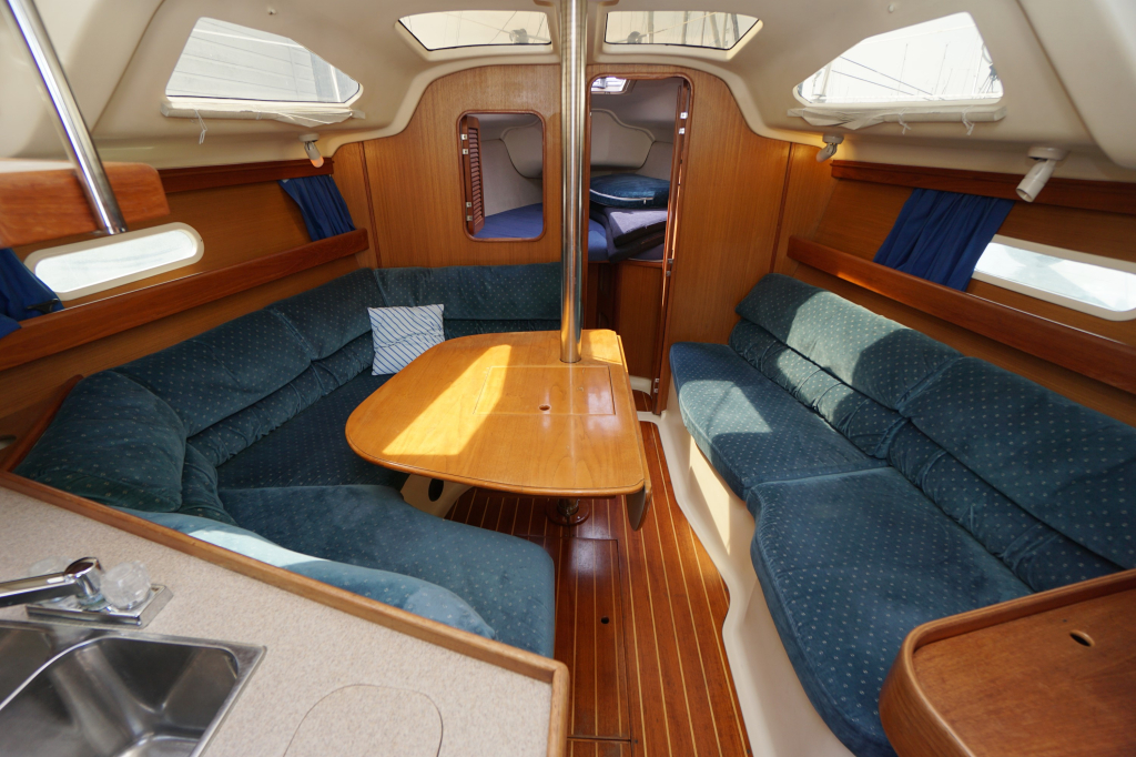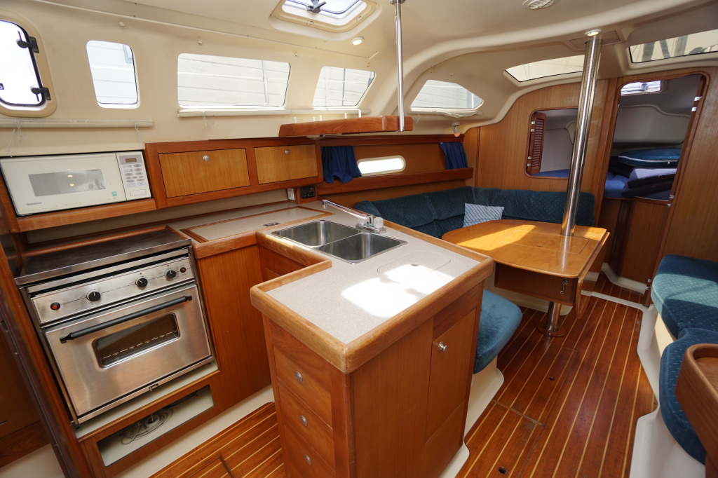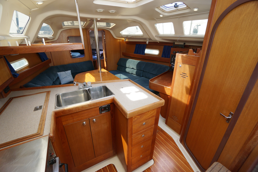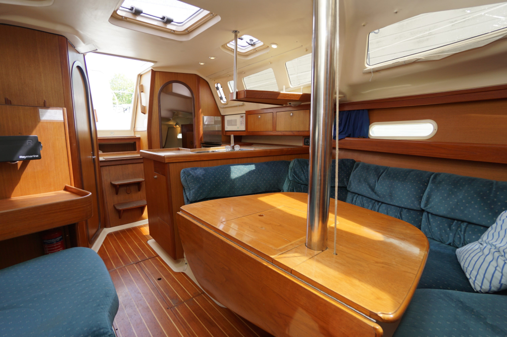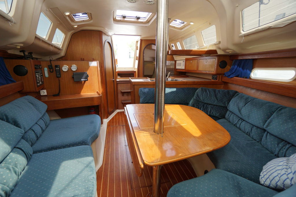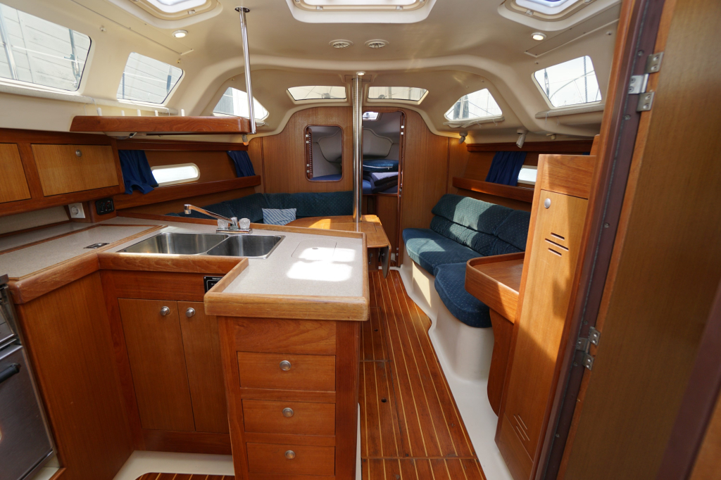 Verder wordt de Hunter 340 in het algemeen gekenmerkt door een zeer ruime kuip, goed toegankelijke gangboorden en een bijzonder ruim interieur. Stahoogte is ca. 195 cm. De salon heeft door alle ramen enorm veel lichtinval. Verder zijn er twee dubbele hutten (waarvan de achterhut echt héél groot is), prettig opgestelde kombuis en een ruime natte cel.