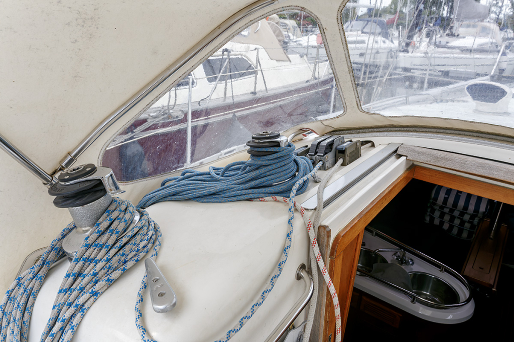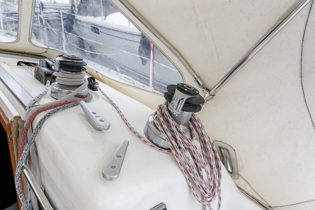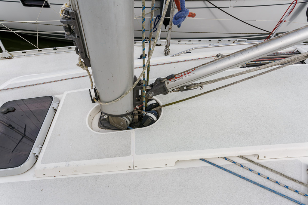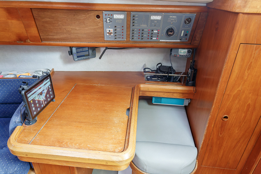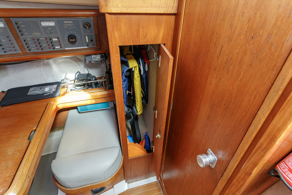 De indeling is klassiek met bij binnenkomst aan bakboord de kombuis, stuurboord de navigatiehoek. Midscheeps is de salon met langsbanken en tafel midscheeps. Zowel in voor als achterschip zijn tweepersoons kooien. Stuurboord achter is de natte cel.