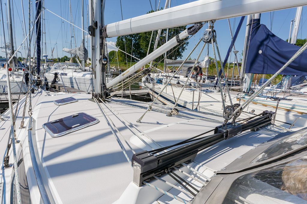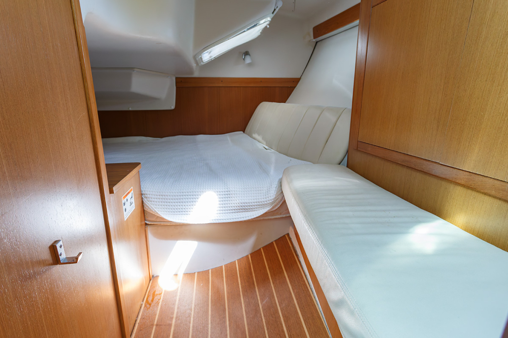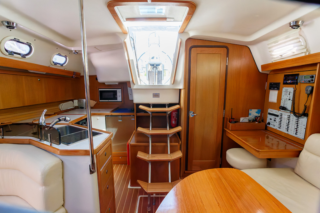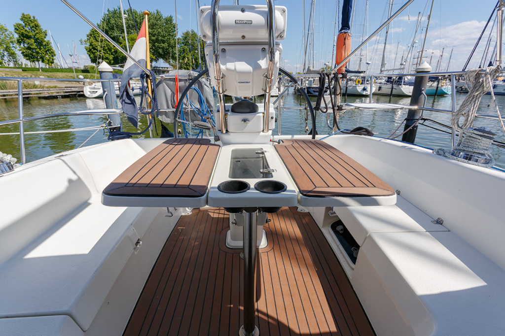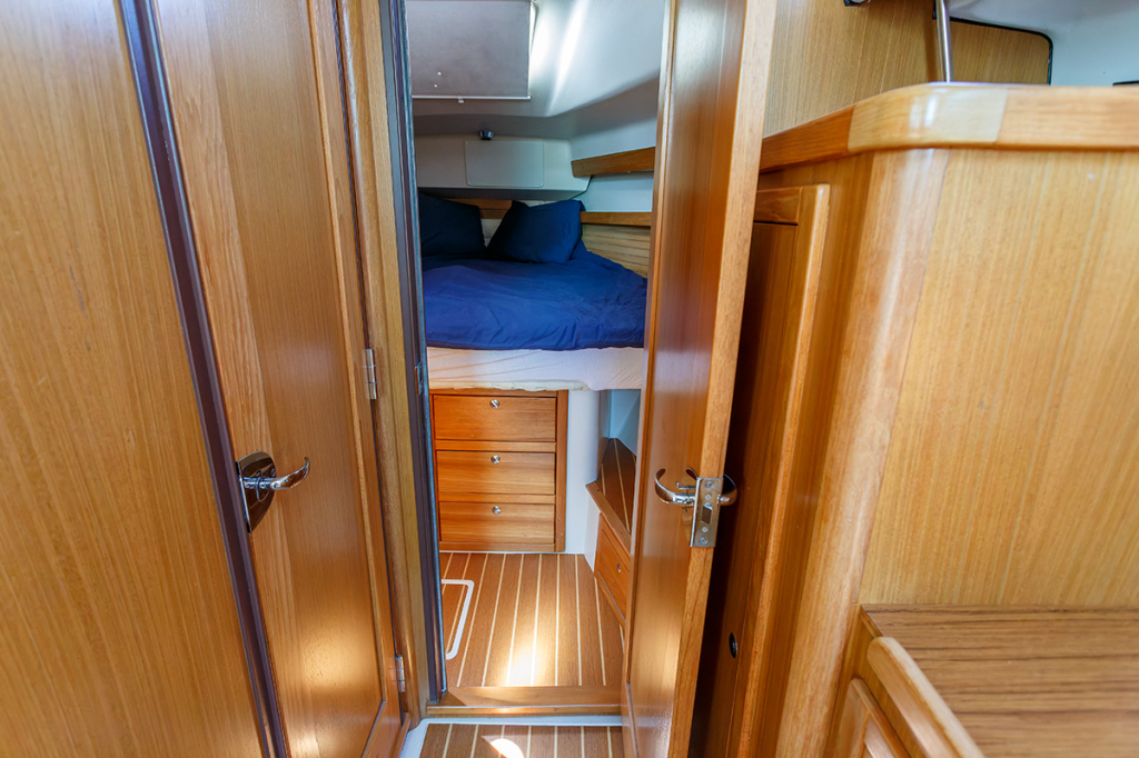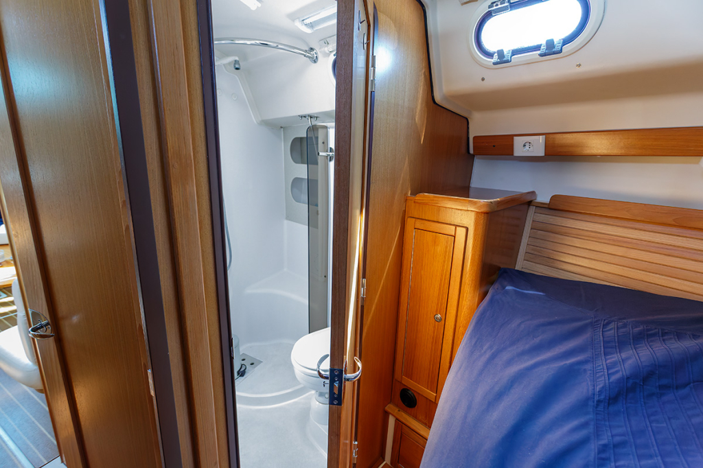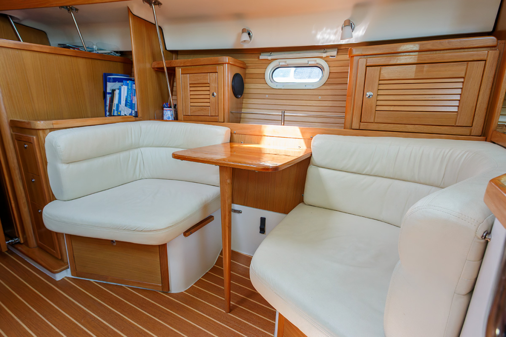 Door gebruik van gelakt teak in combinatie met roomwitte, leatherlook bekleding heeft het interieur een ruime en luxueuze uitstraling. Bij binnenkomst is aan bakboord de navigatiehoek met benodigde apparatuur en rechts de compleet uitgeruste L-vormige kombuis met dubbele spoelbak, koelkast, kooktoestel, oven en magnetron. De L-vormige bank aan bakboord en de 2 ruime stoelen aan stuurboord bieden voldoende ruimte voor de hele bemanning. In de salon zijn extra slaapplaatsen te maken door slimme vulstukken tussen de stoelen en de tafel te verlagen. De hutten zijn voorzien van goede matrassen, in de voorste hut ligt een Wellpure topdekmatras van 4,5 cm. De natte cel is voorzien van een electrisch toilet en douche. Deze boot wordt bemiddeld via kantoor White Whale Yachtbrokers Enkhuizen. Heeft u belangstelling neem dan contact op via enkhuizen@wwy.nl of +31(0)228 855 380 voor meer informatie of het maken van een afspraak voor bezichtiging aan boord. Bezichtigingen zijn mogelijk van maandag t/m zaterdag 09.00 - 17.00.