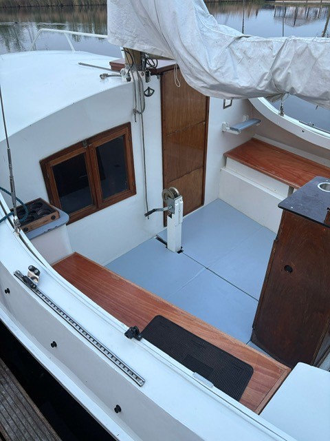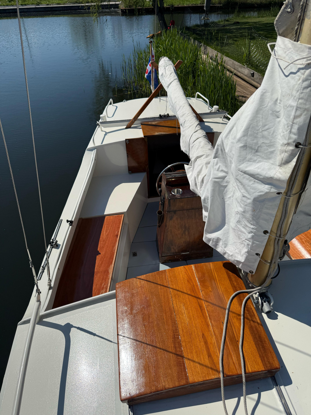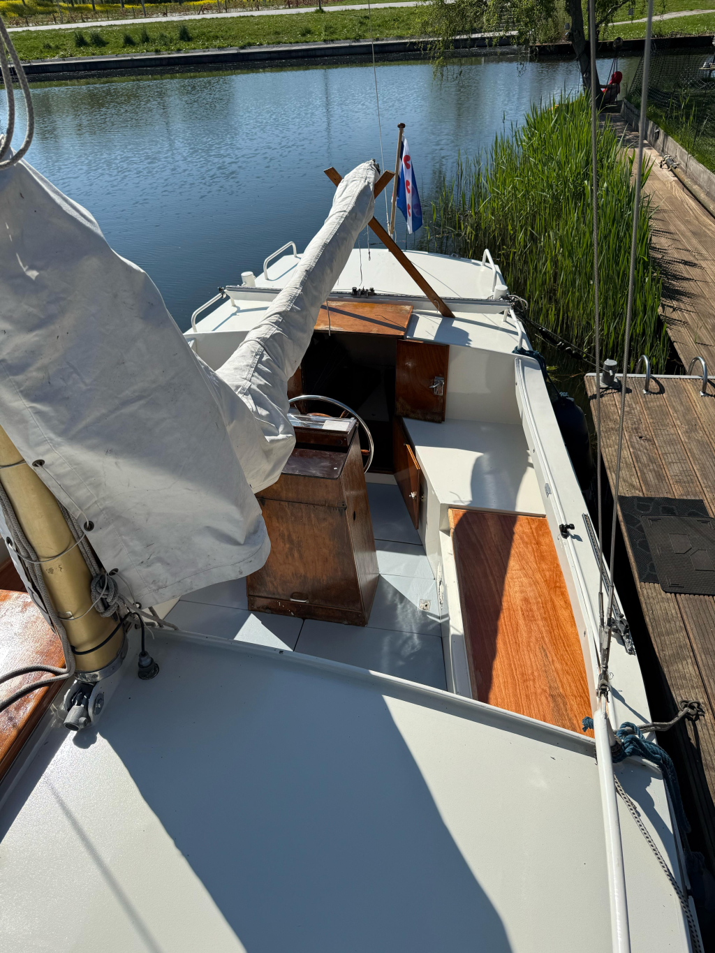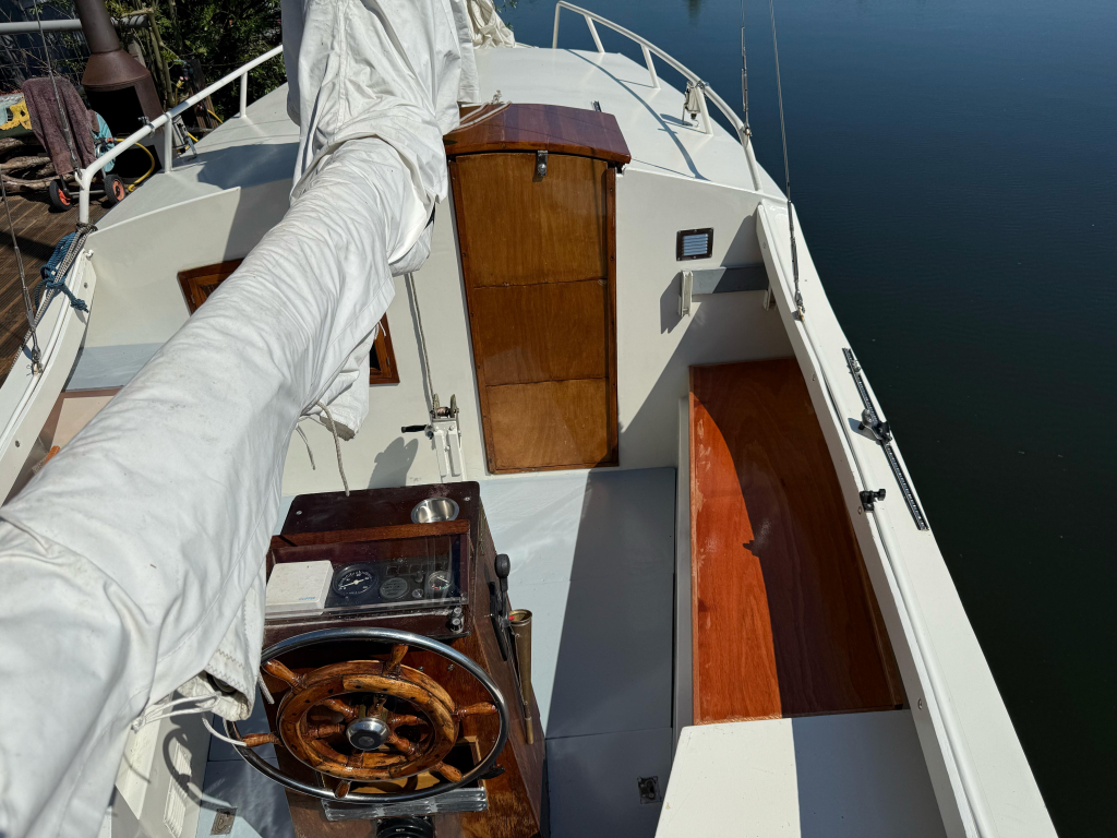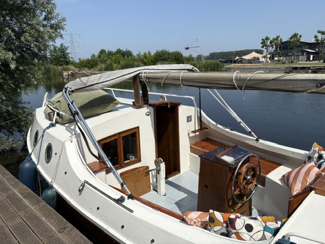 Zoals veel zee zeilers heeft dit schip een midden cockpit. Sinds ik de Mini Globe race volg, die gaan dus met 15 zeilboten van let op 5.80 m de wereld rond, let ik op dit soort zaken.